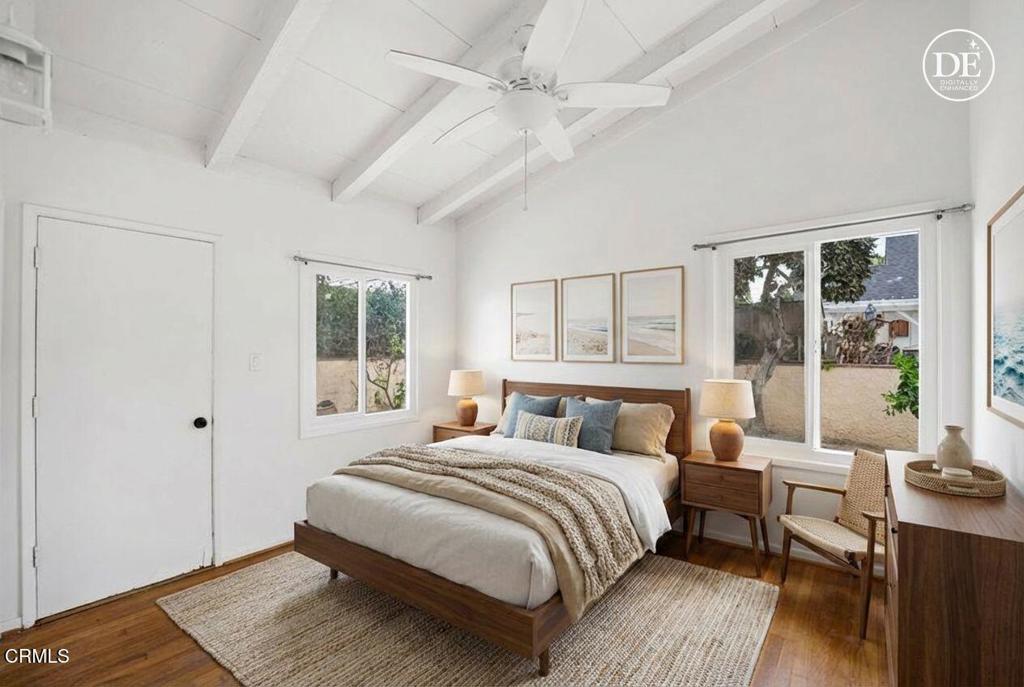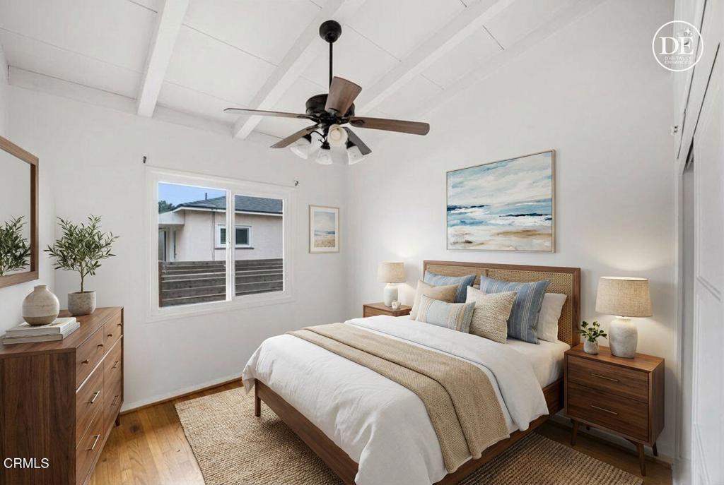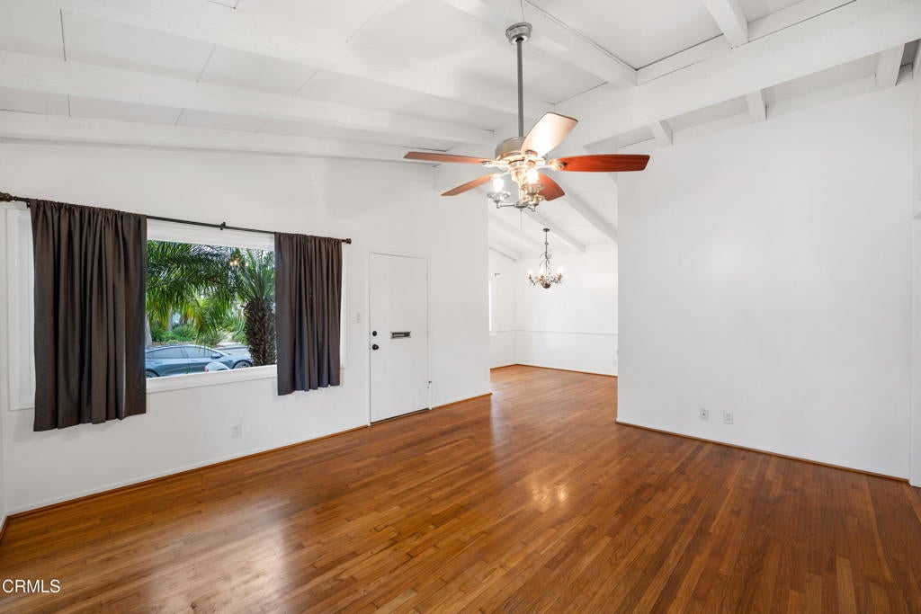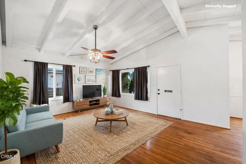 Mid-century California coastal-inspired single-story home showcasing a clean stucco exterior, iconic low-pitched gable roof, and wide overhangs that reflect classic West Coast design. Located in the heart of Midtown Ventura, this home offers a relaxed coastal lifestyle with the convenience of a central, walkable neighborhood. The living and dining areas showcase classic mid-century character with open, light-filled spaces and architectural detail throughout. The living room features exposed beam ceilings, warm hardwood flooring, and a ceiling fan with light, creating a comfortable and inviting gathering space. Neutral wall tones enhance the sense of volume, while natural light highlights the wood floors and clean lines. Updated kitchen featuring warm wood raised-panel cabinetry with crown molding, polished granite countertops, and a full-height linear glass tile backsplash. The space is anchored by durable porcelain tile flooring laid in an offset pattern and complemented by stainless steel appliances, including a gas cooktop, built-in oven, microwave, refrigerator, and dishwasher. A double-basin sink with a commercial-style pull-down faucet sits beneath a large window, filling the kitchen with natural light. Recessed lighting, neutral wall tones, and a functional galley layout create a clean, cohesive, and move-in-ready kitchen with timeless appeal.The backyard offers a private and functional outdoor setting with a spacious paved patio ideal for outdoor dining, entertaining, or lounging. Concrete pavers with brick inlay create defined gathering areas, while raised planter beds and mature trees add greenery and character. A grassy lawn provides space for play or pets, all enclosed by perimeter block walls for privacy. Midtown is known for it's mid-century charm, and easy access to Ventura's beaches, downtown, and harbor. Residents enjoy quick trips to local coffee shops, neighborhood parks, and everyday essentials, along with a short drive or bike ride to the sand, Pierpont, and Ventura Pier