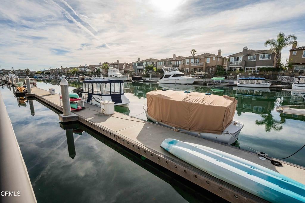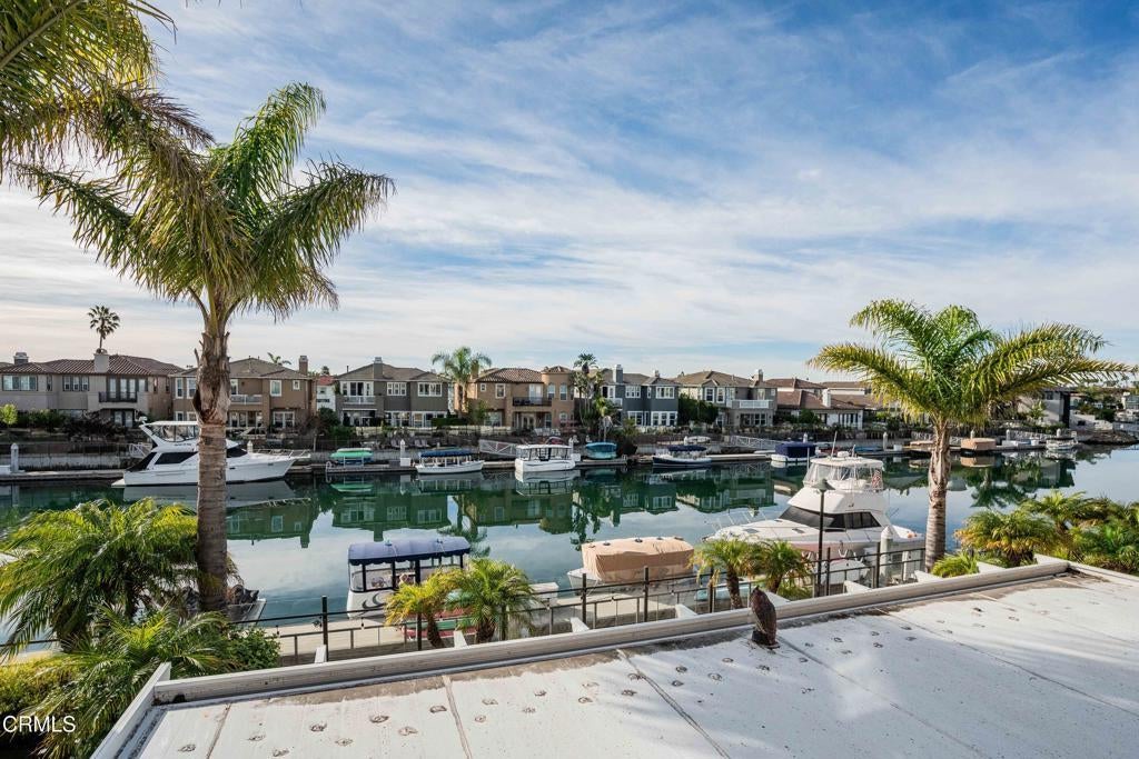 A Seabridge Marina waterfront home with comfortable living spaces that both impress and invite... and is being sold furnished! One bedroom and ensuite bath downstairs, all other bedrooms including primary bedroom, den and office area on second level. Featuring serene water views and filled with natural light with over 50 windows, this home will delight your senses. There is a conveniently located 45' boat dock directly behind house (electric boat included) and popular southern exposure allowing for year 'round enjoyment of water, boats and sunsets from the huge patio and primary bedroom balcony. Patio was beautifully remodeled with travertine, a hot tub, and is one of only a few with a large, covered area (done with permits). Enjoy all the Resort Style amenities that Seabridge offers including a fabulous clubhouse, pool, well-equipped fitness room and more. Walking distance to numerous waterfront restaurants and shops and a five minute drive to three beaches.