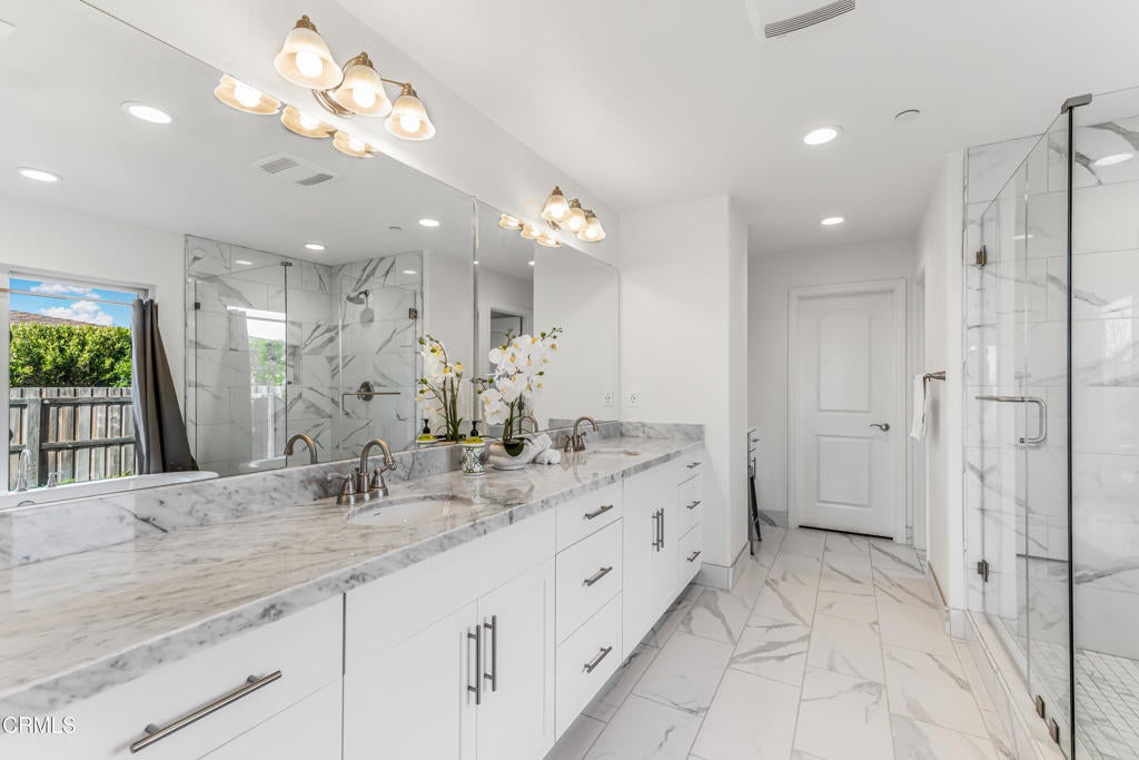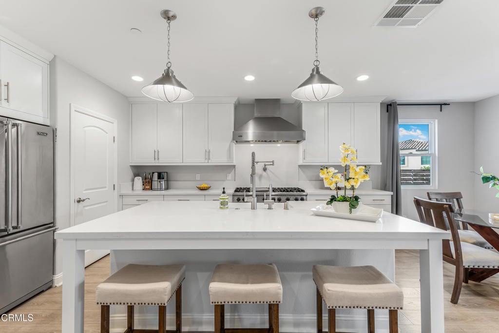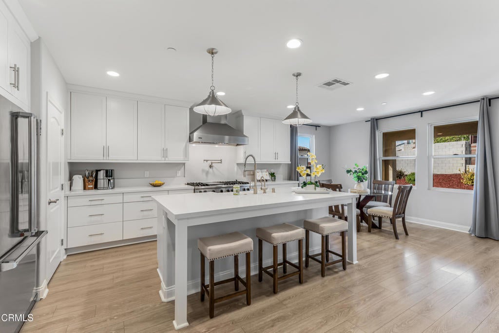 Welcome to this beautifully designed two-story Ventura home, where modern elegance meets everyday comfort. Offering four bedrooms and four bathrooms, this residence showcases a thoughtfully curated floor plan ideal for both sophisticated entertaining and relaxed daily living.Wide-plank laminate flooring flows seamlessly throughout the home, creating a clean, cohesive aesthetic with effortless upkeep. The expansive open-concept living area forms the heart of the home, where a warm fireplace and ceiling fan anchor the family room and transition effortlessly into the dining space and chef-inspired kitchen. Designed with both beauty and function in mind, the kitchen features a generous center island with seating, premium stainless-steel appliances, a gas range, built-in microwave and dishwasher, and a free-standing refrigerator, perfect for hosting gatherings or enjoying quiet evenings at home.A spacious laundry room enhances convenience with abundant cabinetry and a built-in sink, offering both practicality and thoughtful design.Upstairs, the primary suite serves as a private retreat, highlighted by a spa-like ensuite bathroom with dual vanities, a deep soaking tub, a walk-in shower, and an expansive walk-in closet. Each additional bedroom is generously sized and offers exceptional versatility, including a desirable main-level bedroom with its own ensuite bath, walk-in shower, and walk-in closet, ideal for guests or multi-generational living. Another bedroom features a private ensuite with a tub and shower combination and a walk-in closet, ensuring comfort and privacy for all.Step outside to a spacious, fully fenced backyard with a covered patio, creating an inviting environment for outdoor entertaining, family gatherings, or peaceful relaxation year-round.Move-in ready and rich with modern upgrades, this exceptional Ventura home offers a rare blend of luxury, flexibility, and indoor-outdoor living in one of the area's most desirable locations.