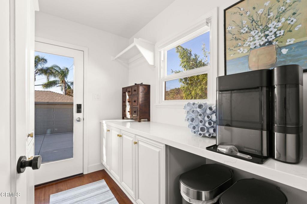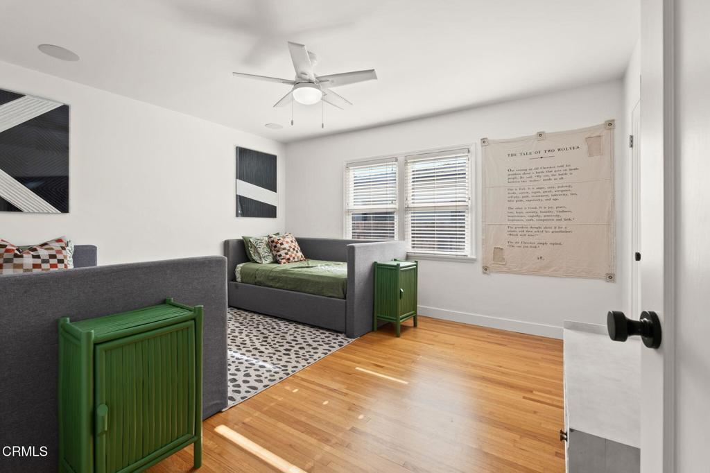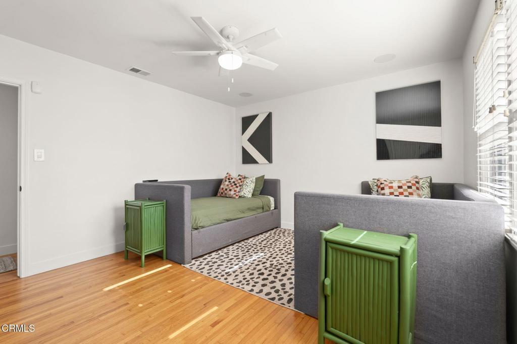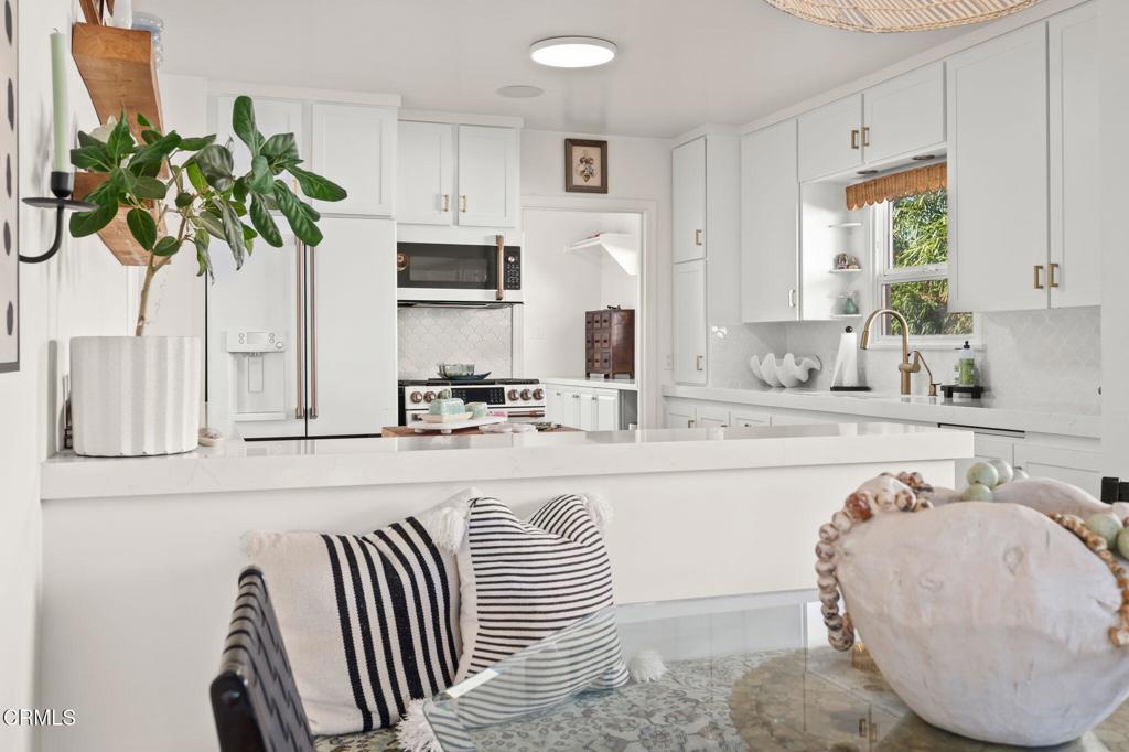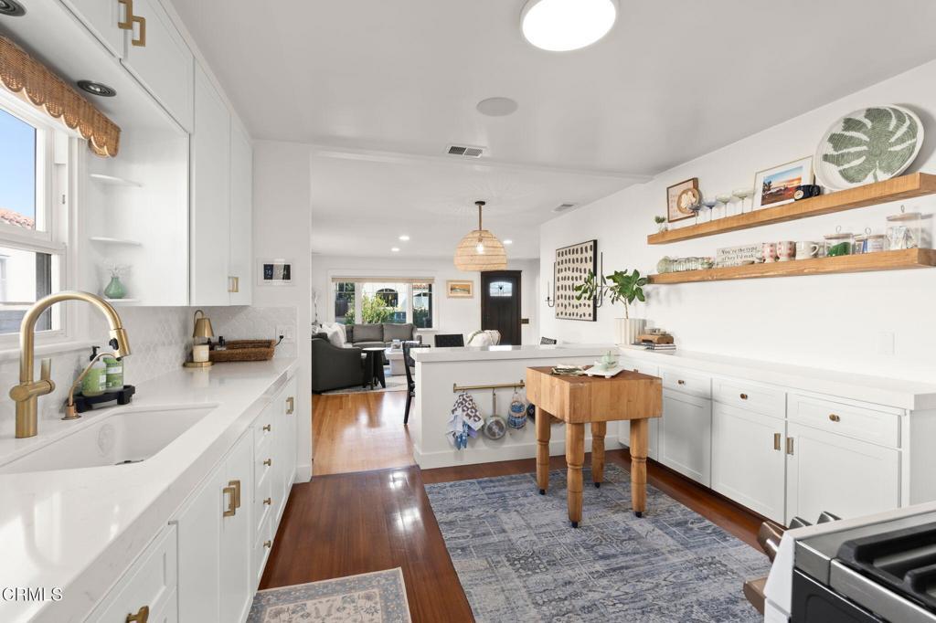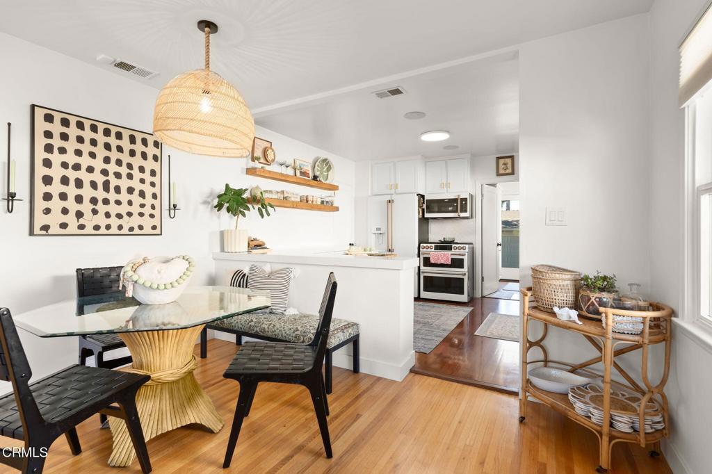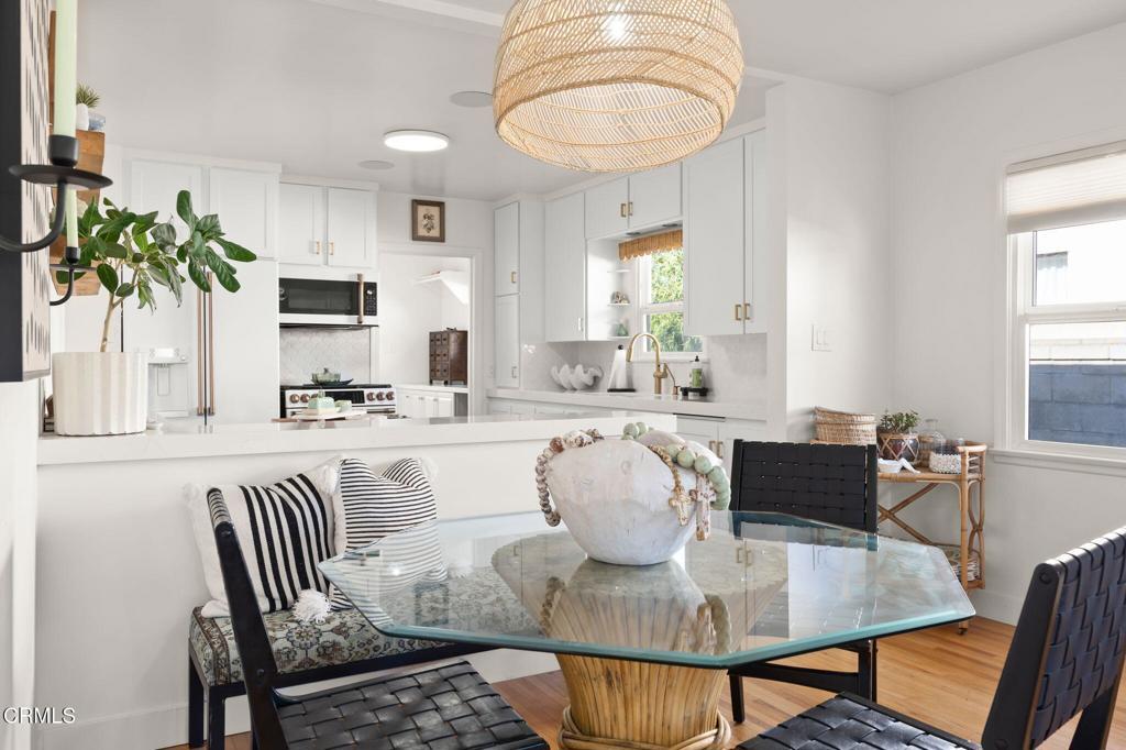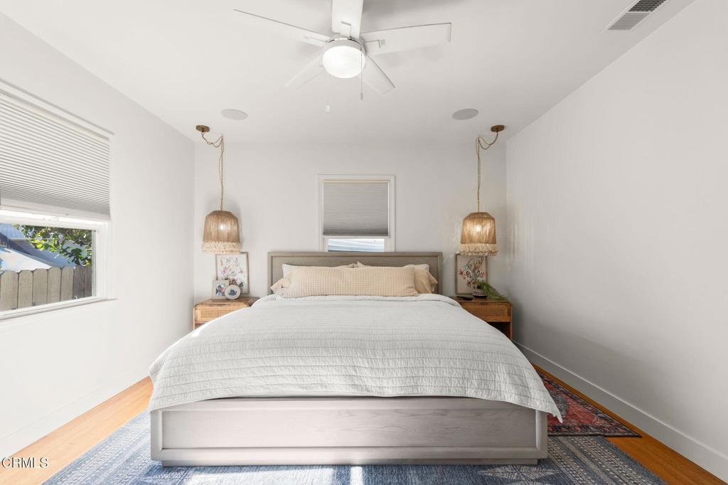 Located in one of Midtown Ventura's most desirable neighborhoods, this recently remodeled 3-bedroom, 2-bath residence showcases a thoughtfully curated coastal-modern design with intentional finishes throughout. The open living and dining areas are anchored by original, restored hardwood floors and filled with natural light from Andersen windows at the front of the home. One bedroom is positioned just off the living space, ideal for a home office or flex room, while the remaining bedrooms are arranged along the left side of the home, with the primary suite privately set toward the rear and featuring a walk-in closet. The updated kitchen blends modern cabinetry with functional design and connects to a dedicated laundry area with an additional quarter bath. Outdoors, the spacious backyard offers newer turf, room to entertain, and gated boat or RV parking behind the two-car garage, which includes an attached bonus room with ADU potential. Completing the home is an impressive, fully integrated security system and a top-tier whole-home surround sound system, enhancing both comfort and peace of mind. This is a turnkey Midtown Ventura home where design, technology, and lifestyle come together seamlessly.