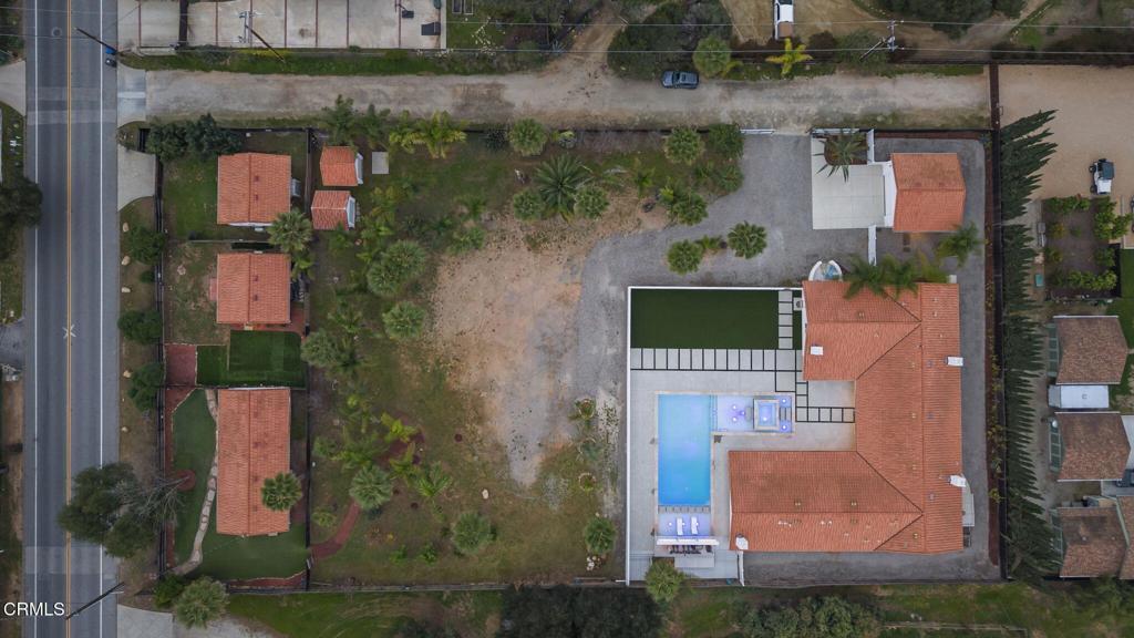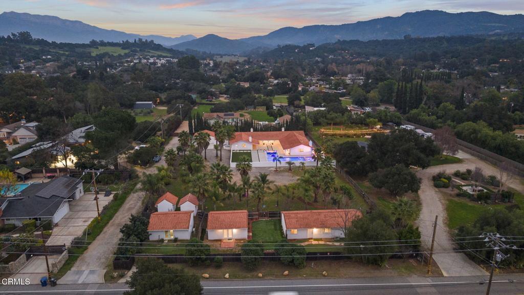 Exceptional gated Ojai compound with four independent structures, and a resort-style pool courtyard on 1.41 private acres. Designed as a true multi-structure estate, the property spans four separate buildings making it ideal for multi-generational living, creative use, or boutique retreat potential. The resort-style pool courtyard anchors the estate and delivers that private resort experience with an approximately 40-foot pool, dual Baja shelves, six waterfalls, a dramatic 20-foot fire wall, an inset spa, and a glow-in-the-dark pathway, all surrounded by new luxury turf and is visible from much of the main residence. The over 4,000-sq-ft main home features 6 bedrooms and 6 bathrooms with high ceilings, abundant natural light, and seamless indoor-outdoor flow, along with an attached mother-in-law suite offering its own private exterior entrance for added independence. A discreet concrete ramp serves the rear primary suite, providing elegant accessibility without compromising design. A separate 3-bedroom, 1-bath guest house includes its own gated street entrance, open kitchen, exterior laundry, fenced yard with turf, and a mini-split HVAC system for individualized year-round comfort. Two additional structures were used for family members with each having private entrances, fenced yards, and mini-split systems, making them ideal for home offices, studios, family or visiting friends. Mature fruit trees are scattered throughout the grounds, while a large open central area creates natural separation between structures and offers future possibilities such as gardens, recreation space, additional parking, or expansion. This rare Ojai retreat blends privacy, versatility, and long-term potential, offering a compound-style layout designed to support the way you live today while leaving room to grow tomorrow.