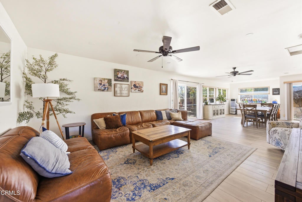 Relaxed Living on a Sprawling 17,000 SF country-like lot.Located near the tranquil Sespe Creek and framed by soft, rolling hill views, this 2,400 sq ft ranch-style residence offers a level of comfort rarely found in the area. Thoughtfully finished upscale finishes and a modern sensibility, the home blends timeless elegance with everyday livability. Upgrades include luxury vinyl floor and vinyl windows.A Distinctive Split-Wing Design - The floorplan unfolds with a sense of privacy and seclusion. - The primary suite occupies its own wing, featuring a beautifully updated bath with quartz surfaces and refined fixtures. - On the opposite side of the home, the family wing offers three bedrooms and two luxuriously remodeled baths, creating an ideal separation of space for guests, children, or multigenerational living.- The chef's kitchen has been fully remodeled with quartz countertops, custom cabinetry, and upgrades that accent both form and function. - All baths have been thoughtfully redesigned and updated. - A dedicated home-school center or library/office provides a polished, quiet environment for productivity. - The expansive great room flows seamlessly into the formal dining area, creating a thoughtful setting for entertaining or family gatherings.Oh, the Outdoors! The property has an impressive **17,000 sq ft lot:- Space for lush gardens, outdoor living areas, or a future second dwelling unit. - Views of the surrounding hills enhance the sense of privacy and natural beauty. - The proximity to Sespe Creek adds a peaceful, almost retreat-like ambiance.Owners have found their next home and will segue from Island View with wonderful memories.