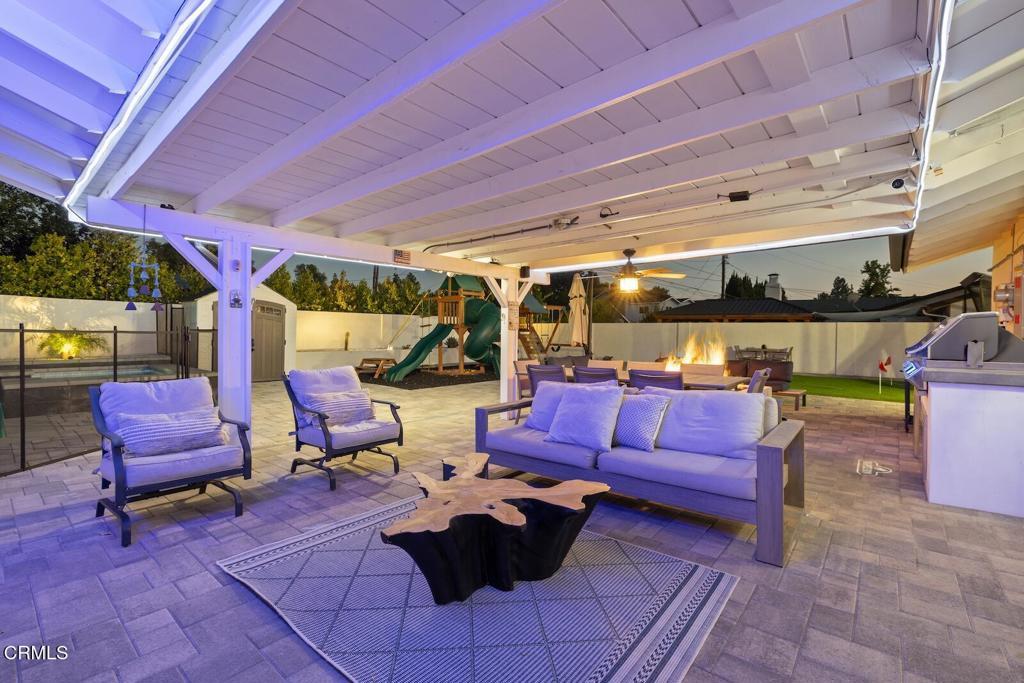 Fully remodeled turnkey pool home with major system upgrades, including a new HVAC system, new water heater, new 200-amp electrical panel with pool sub-panel, new R32 attic insulation, upgraded saltwater pool equipment, designer window treatments from The Shade Store, LowVoltage landscape lighting, and smart-home upgrades throughout.Located on a desirable corner lot, this move-in-ready property offers quintessential indoor-outdoor California living with modern updates and long-term reliability rarely found in homes of this era. Inside, the bright open-concept floor plan is designed for today's lifestyle. Wide-plank flooring, expansive windows, recessed lighting, and a statement shiplap fireplace create a clean contemporary feel while maintaining warmth and functionality. The living room, dining area, and kitchen flow seamlessly together, creating an ideal space for everyday living and entertaining. The updated kitchen features white shaker cabinetry, quartz countertops, a textured subway-tile backsplash, stainless steel appliances, a single-basin stainless steel sink, a built-in microwave, floating wood shelves, and generous counter space with ample storage.The spacious primary suite offers a private retreat with a fully renovated en-suite bath featuring designer tile, a custom vanity, and modern fixtures. Step outside to a resort-style backyard designed for year-round California living. Enjoy a sparkling pool and spa, a custom gas fire pit lounge area, a covered patio with outdoor dining space, a mounted TV for game days, a built-in BBQ area, a low-maintenance artificial turf putting green, and a dedicated play structure zone. The completely redesigned front yard features upgraded pavers and enhanced curb appeal, creating a welcoming first impression on this desirable corner lot with RV parking. This home combines lifestyle amenities with extensive mechanical upgrades, delivering both beauty and peace of mind.