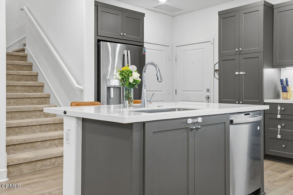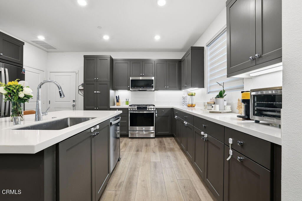One of the most desirable end units to hit Sycamore Grove. Only eight homes in the entire community offer this additional private side patio, and this premium location features just one shared wall and does not back to a parking lot.This newer 4 bedroom, 3.5 bath home offers approximately 1,819 sq ft of light-filled, open-concept living designed for modern lifestyles. The chef's kitchen is a showpiece with a large quartz island, stainless steel appliances, 5 burner gas cooktop, deep single basin sink, and pantry with pull-out shelving, flowing seamlessly into the main living area ideal for entertaining.Upstairs, the spacious primary suite offers a walk-in closet, oversized shower, and quartz counters. A secondary bedroom includes its own attached full bath, perfect for guests or multigenerational living. The first floor features an ADA-size powder room for added versatility.Loaded with smart home technology including Ring security system, Honeywell smart thermostat, Moen Flo smart water monitoring system, tankless water heater with hot water recirculation, leased solar, and an EV-ready garage wired for charging with epoxy floors.Sycamore Grove delivers true resort living with pool, cabanas, fire pits, BBQ areas, bocce court, park space, community garden, and pay EV charging stations. A private gated pedestrian entrance provides direct access to Trader Joe's, Target, and dozens of shops and restaurants just steps away.Highly upgraded end units with this rare patio layout and prime location rarely become available. This is the one buyers wait for.