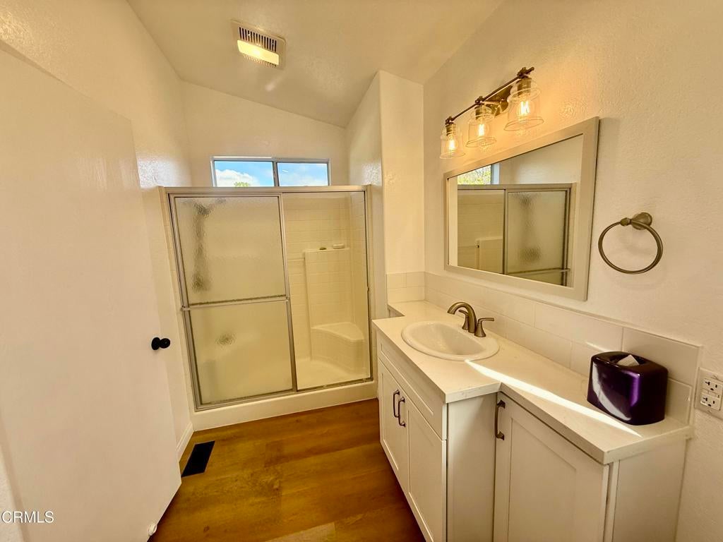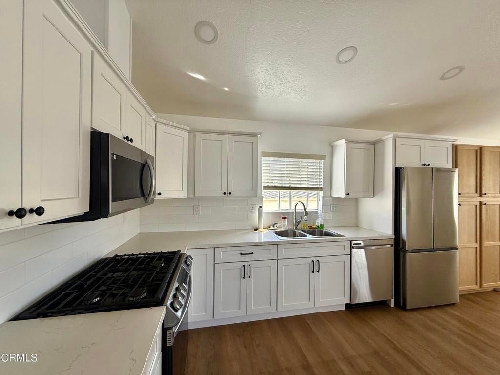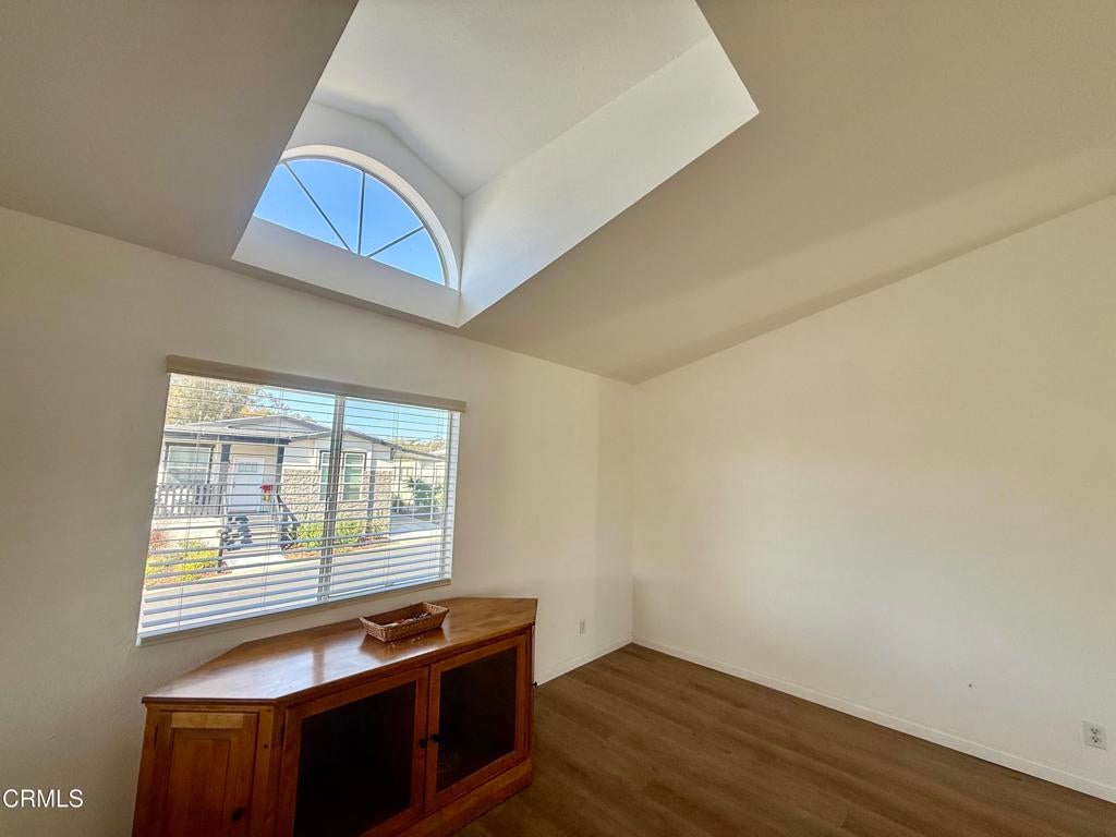 3 Bedroom + 2 Bathrooms in La Posada 55+ park .This home is beautiful with cathedral ceilings and stainless steel appliance including a washer & dryer. Wood like waterproof laminate flooring. Rare side by side carport parking. Walk to restaurants, Starbucks, grocery store and more. Its close to 101 freeway and a short drive to the beach and harbor. Small pet welcomed. Application to the park ( with park management ) to coincide with accepted offer. Pay one of the lowest space fees in Ventura! Also beautifully maintained small park. Pool and spa Visitor parking close to the home