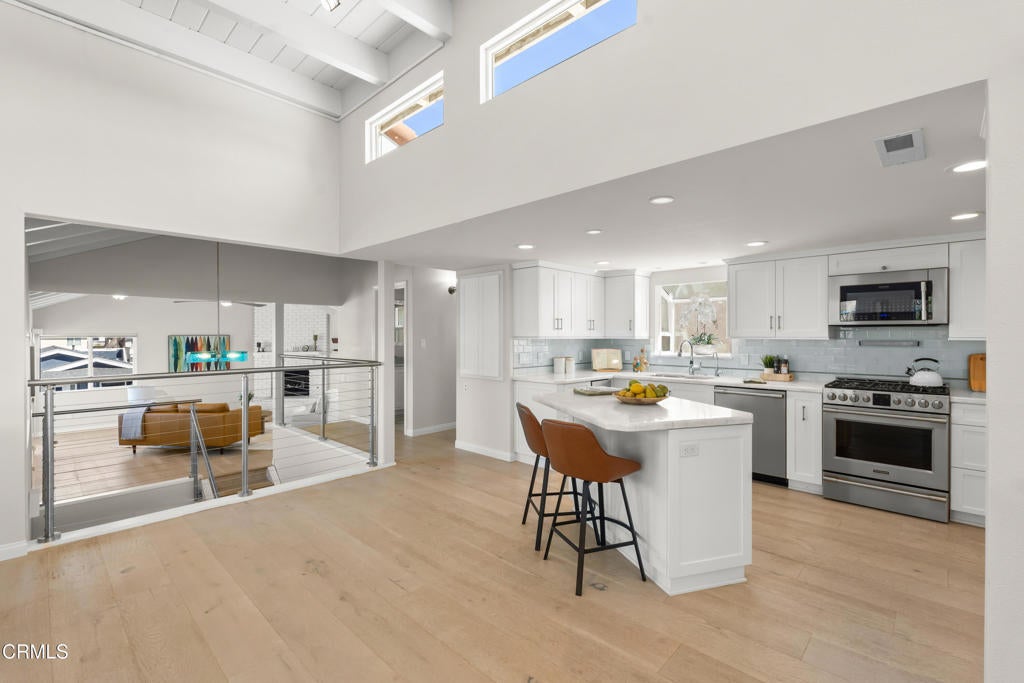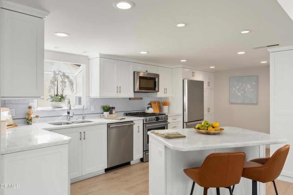 Welcome to Mandalay Shores, a beautifully remodeled coastal home with ocean views just steps from the sand. Designed for the ultimate Oxnard beach lifestyle, the home offers multiple decks for relaxing or entertaining while enjoying the spectacular sunsets that make this community so special.The first level is designed for flexible living and features two bedrooms, an updated bathroom, and a secondary kitchenette with living space -- ideal for guests, multi-generational living, entertaining, or even a private movie room.Upstairs, the primary suite offers a private balcony, walk-in closet, and a beautifully remodeled Carrara marble bathroom. The family room features a gas fireplace, built-in storage, and a deck with ocean views, creating the perfect space for sunset gatherings or quiet mornings by the sea.The chef's kitchen showcases all-new appliances, Carrara marble countertops, a center island, and thoughtful design that opens to the living room, family room, and oversized dining area, creating seamless indoor-outdoor flow for everyday living and entertaining.Recent upgrades include new flooring throughout, recessed lighting, ceiling fans, tankless water heater, mini-split HVAC system, upgraded electrical panel, and a new roof.Outside, the landscaped front and side yards provide space for outdoor dining, entertaining, or adding a spa, while the two-car garage offers convenience and additional storage.Located near Channel Islands Harbor, the home provides easy access to boating, kayaking, paddleboarding, golf, shopping, and local dining. Here, coastal charm, modern comfort, and Ventura County's natural beauty come together to create a true beach retreat.