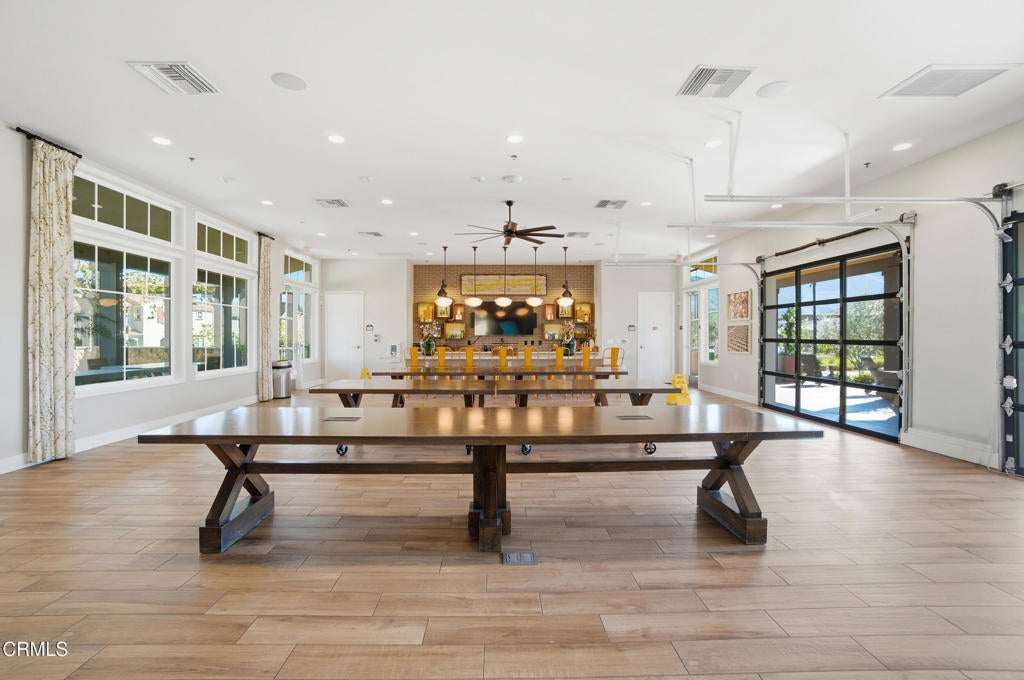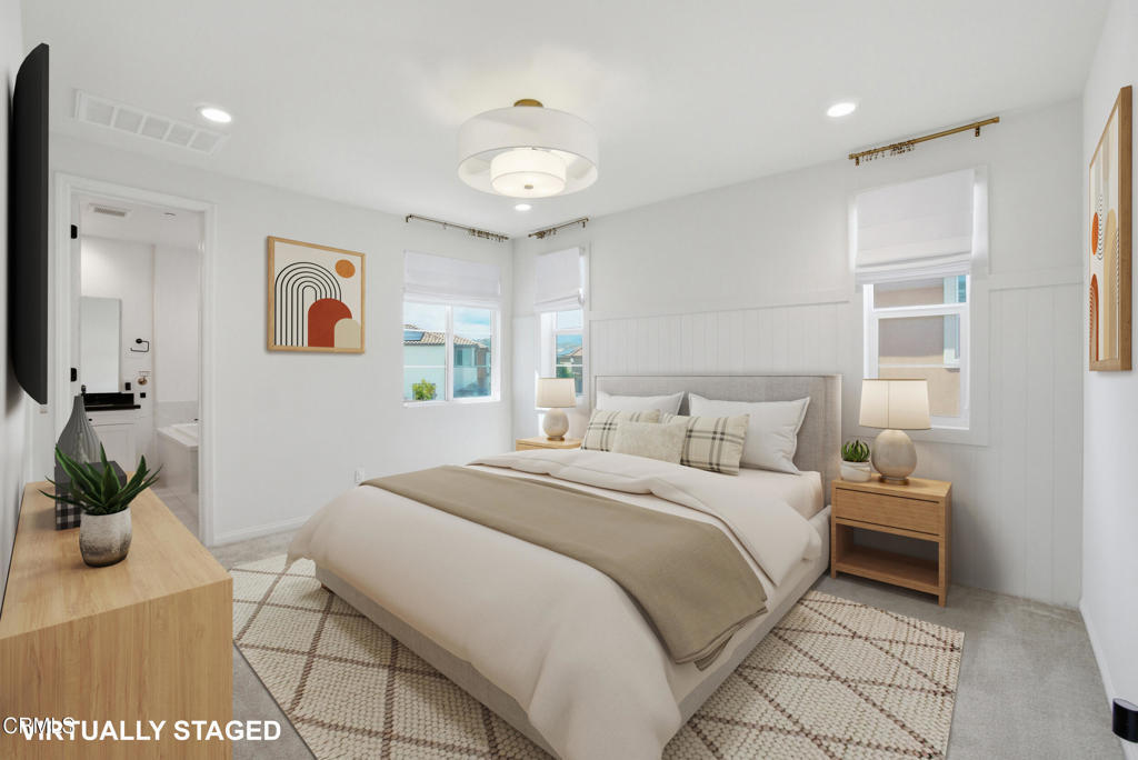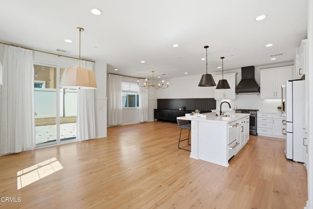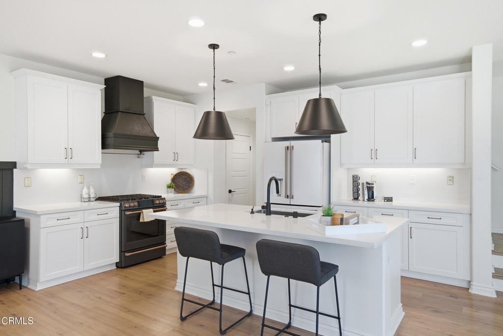 Welcome to Limoneira at Harvest, a newer community where modern living meets vintage charm. This highly upgraded immaculate 4-bedroom corner lot home offers privacy with no shared walls, mountain views and a thoughtfully designed open layout. Warm finishes, wainscoting accents and custom vintage lighting create a cozy, inviting atmosphere throughout. The kitchen features GE Cafe appliances, under-cabinet lighting and opens to a spacious living area with added cabinetry for extra storage. Enjoy turnkey convenience with custom window treatments, included washer and dryer, and a low-maintenance backyard complete with pavers, synthetic turf and storage shed. The garage is outfitted with additional shelving and the home also comes equipped with solar panels making this home as functional as it is beautiful.