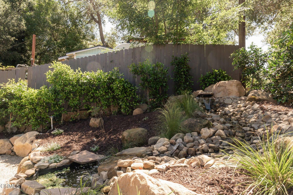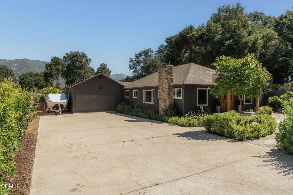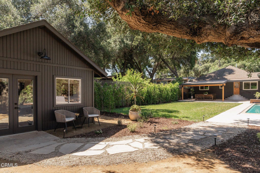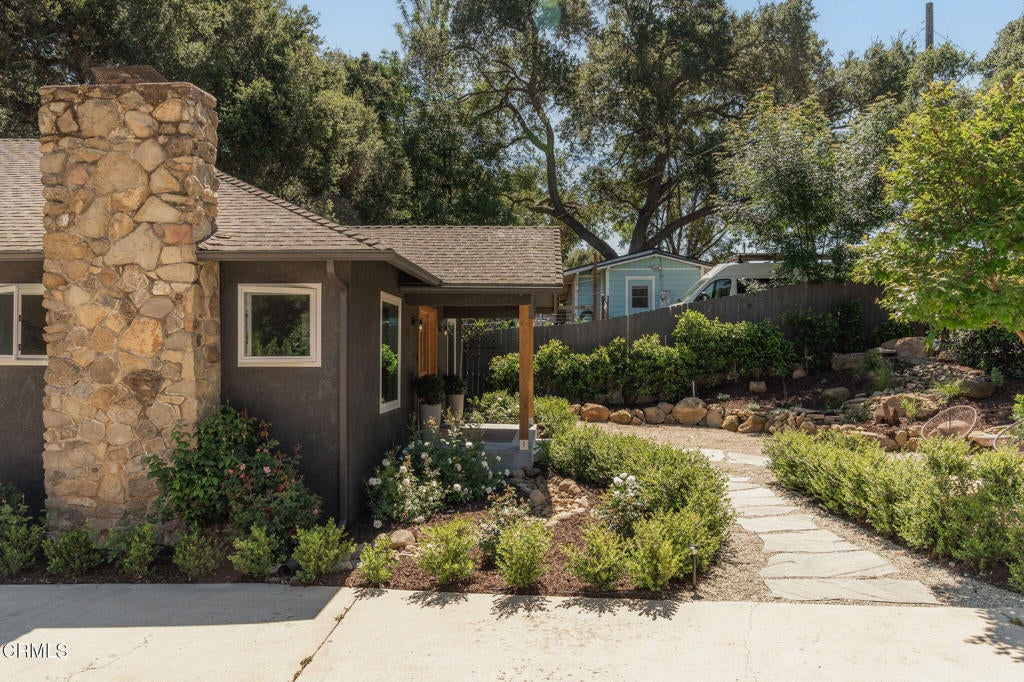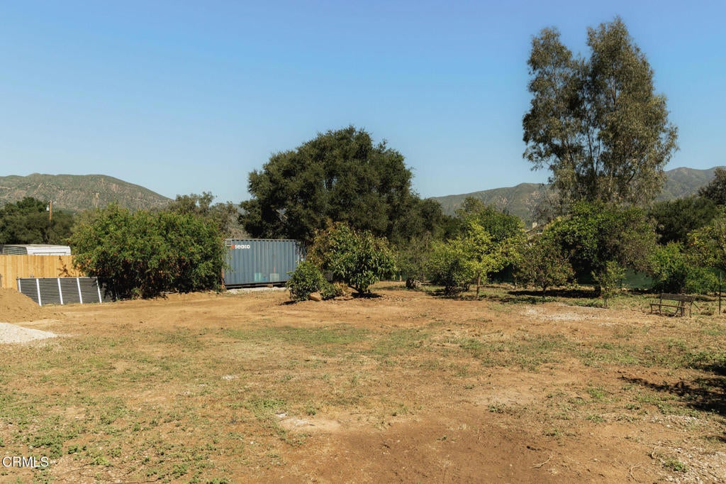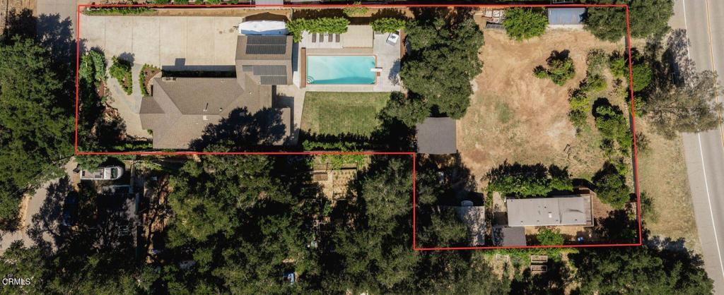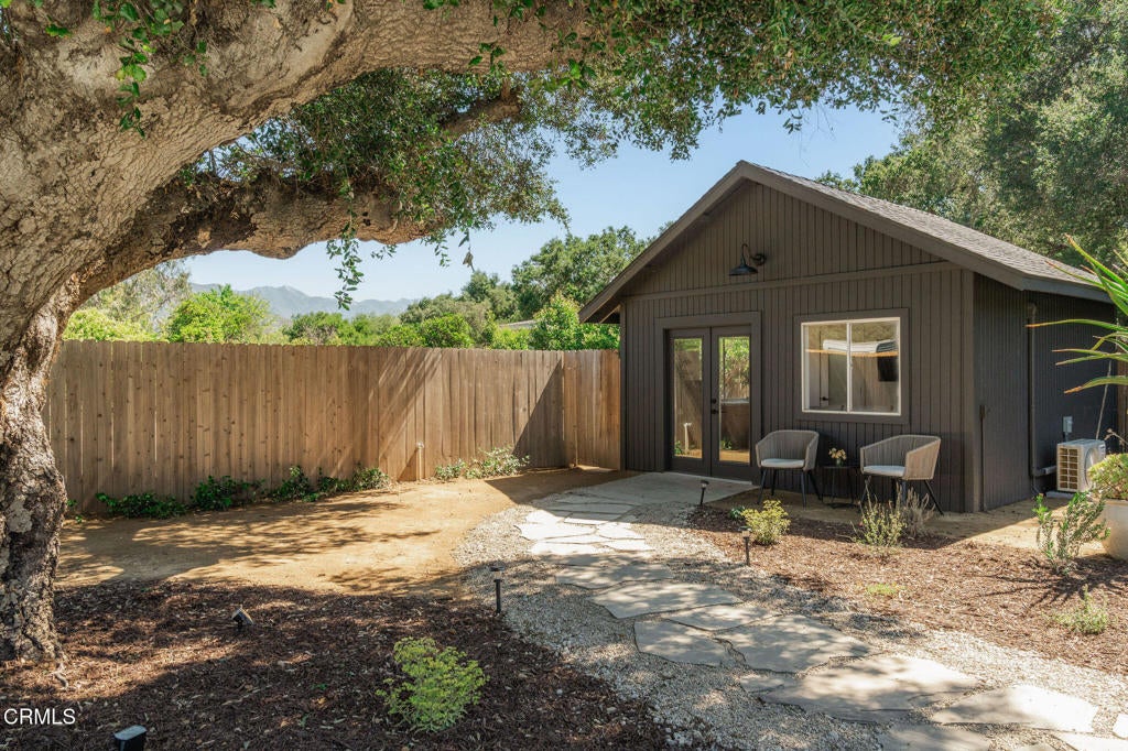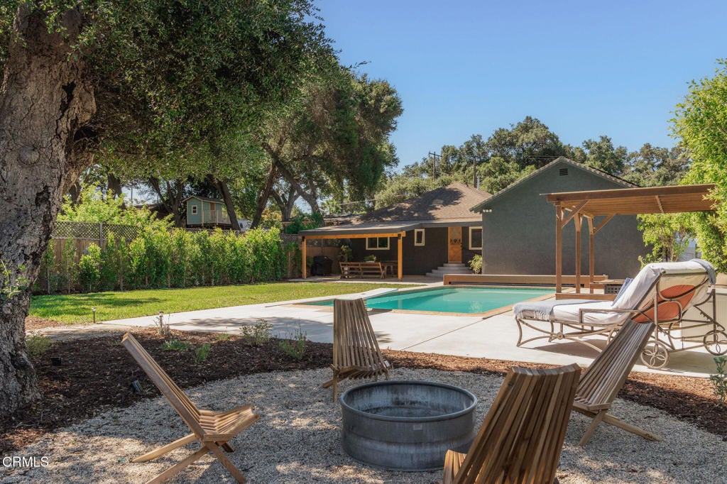 Tucked at the end of a quiet cul-de-sac in Meiners Oaks, this inviting property offers peaceful living with beautiful mountain views, including glimpses of Chief's Peak. The main residence features 3 bedrooms and 2 bathrooms across approximately 1,600 sq ft, highlighted by recently refinished solid red oak floors, remodeled bathrooms, and a lightly updated kitchen. The inviting living space, centered around a charming fireplace, creates the perfect place to gather, unwind, and feel at home. Set on over half an acre, the property includes an expansive driveway and an oversized two car garage with newly added storage above. Step outside and the property truly begins to unfold. Beneath a newly built patio cover, long afternoons turn into memorable evenings, dining al fresco in the soft Ojai light. The backyard is anchored by a majestic oak tree, with a sparkling pool, cabana, and separate 256 sq ft pool house/office thoughtfully arranged around it. Whether hosting guests, creating a private workspace, or enjoying a quiet moment poolside, the setting offers exceptional flexibility and charm. Beyond the main yard, the property opens to a variety of mature fruit trees including avocado, citrus, persimmon, pomegranate, apricot, and nectarine. With ample space for animals, gardening, or expanded use, the property also includes a large metal-covered barn, a 20-foot shipping container for storage, and convenient rear access from the road behind. A rare opportunity to enjoy space, versatility, and the Ojai lifestyle in a peaceful setting, plus a special feature you'll have to see in person.