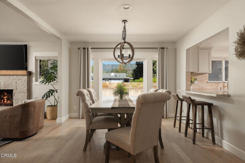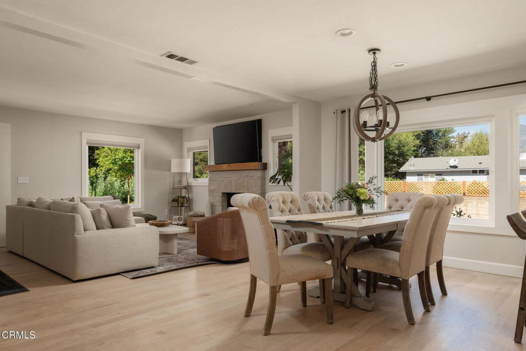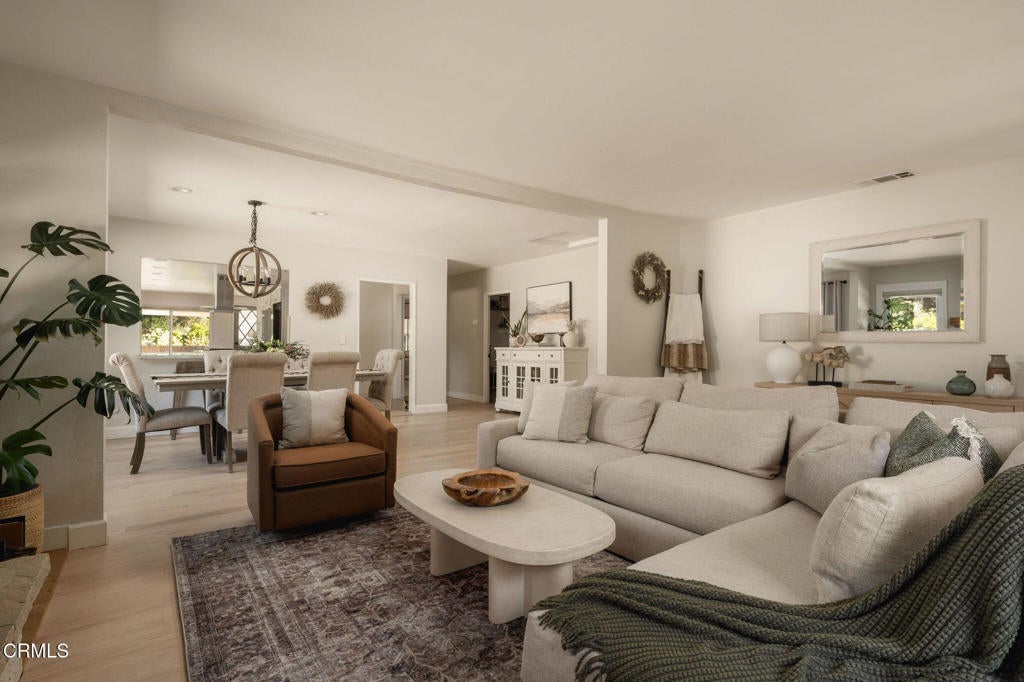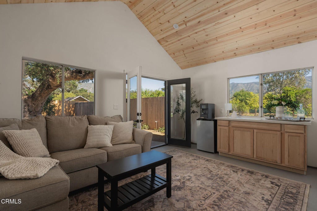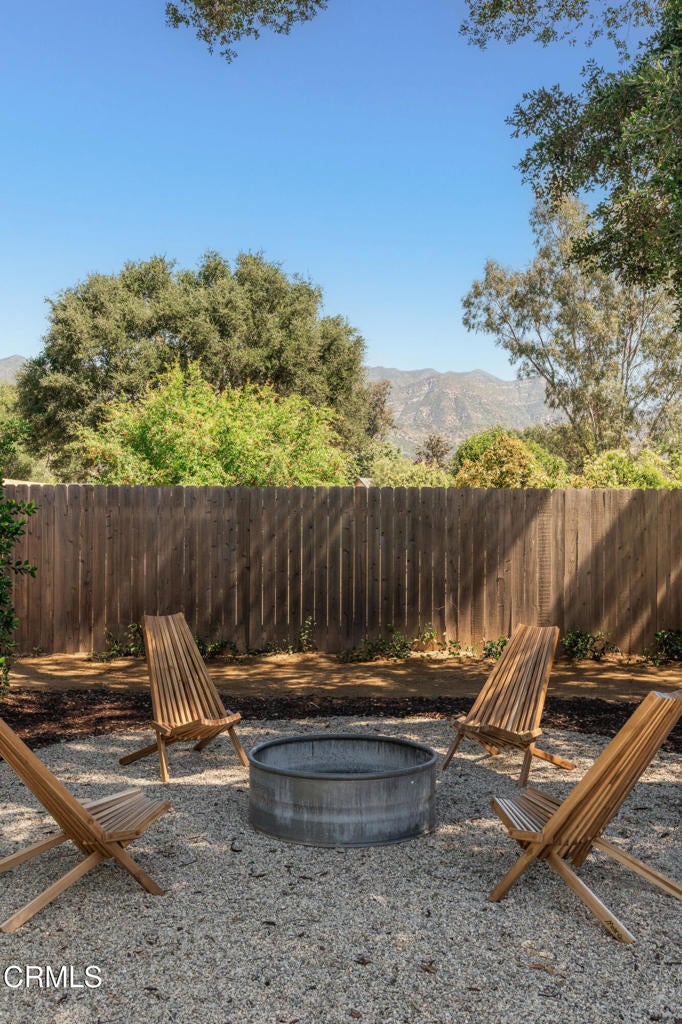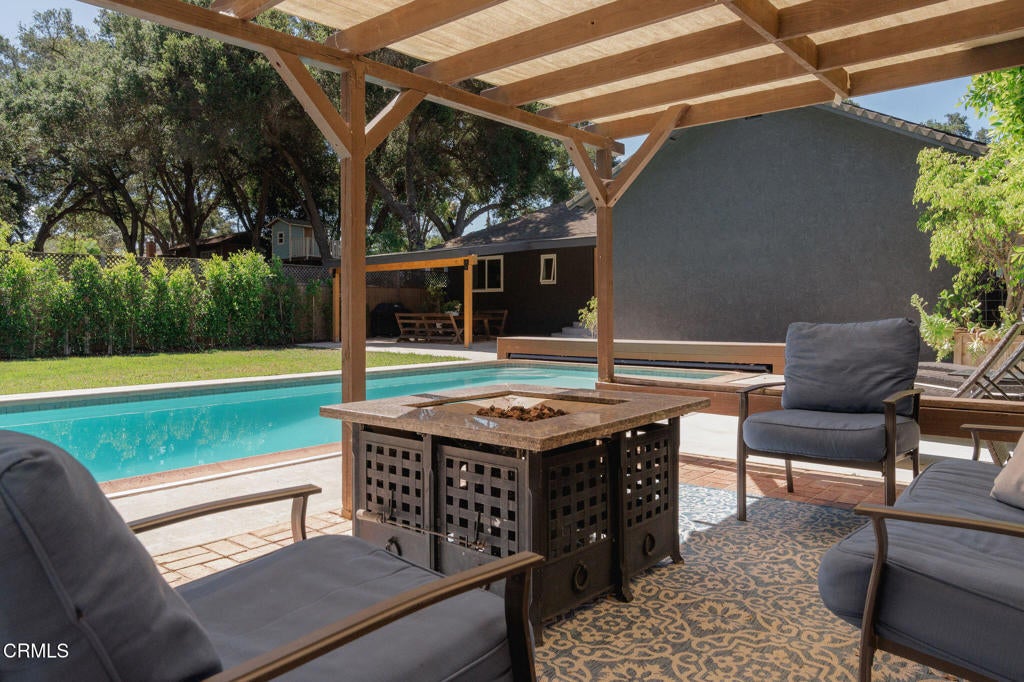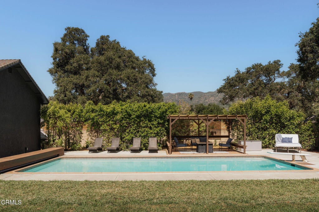 Tucked at the end of a quiet cul-de-sac in Meiners Oaks, this inviting property offers peaceful living with beautiful mountain views, including glimpses of Chief's Peak. The main residence features 3 bedrooms and 2 bathrooms across approximately 1,600 sq ft, highlighted by recently refinished solid red oak floors, remodeled bathrooms, and a lightly updated kitchen. The inviting living space, centered around a charming fireplace, creates the perfect place to gather, unwind, and feel at home. Set on over half an acre, the property includes an expansive driveway and an oversized two car garage with newly added storage above. Step outside and the property truly begins to unfold. Beneath a newly built patio cover, long afternoons turn into memorable evenings, dining al fresco in the soft Ojai light. The backyard is anchored by a majestic oak tree, with a sparkling pool, cabana, and separate 256 sq ft pool house/office thoughtfully arranged around it. Whether hosting guests, creating a private workspace, or enjoying a quiet moment poolside, the setting offers exceptional flexibility and charm. Beyond the main yard, the property opens to a variety of mature fruit trees including avocado, citrus, persimmon, pomegranate, apricot, and nectarine. With ample space for animals, gardening, or expanded use, the property also includes a large metal-covered barn, a 20-foot shipping container for storage, and convenient rear access from the road behind. A rare opportunity to enjoy space, versatility, and the Ojai lifestyle in a peaceful setting, plus a special feature you'll have to see in person.