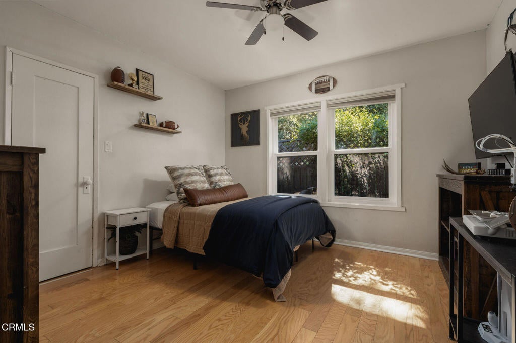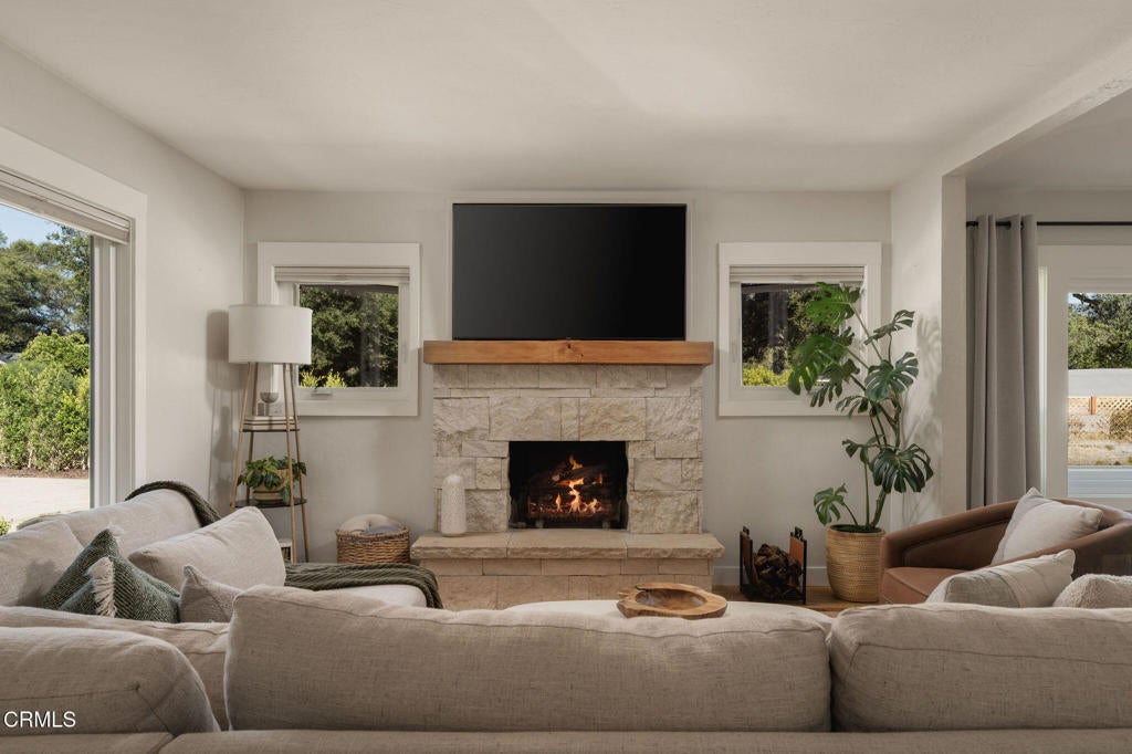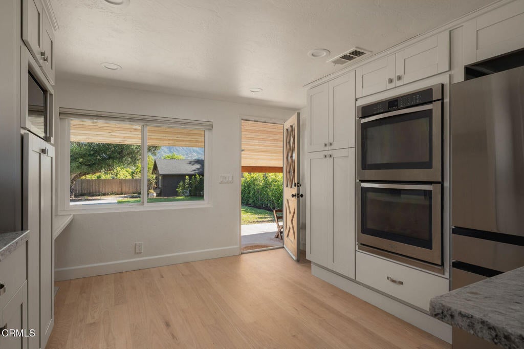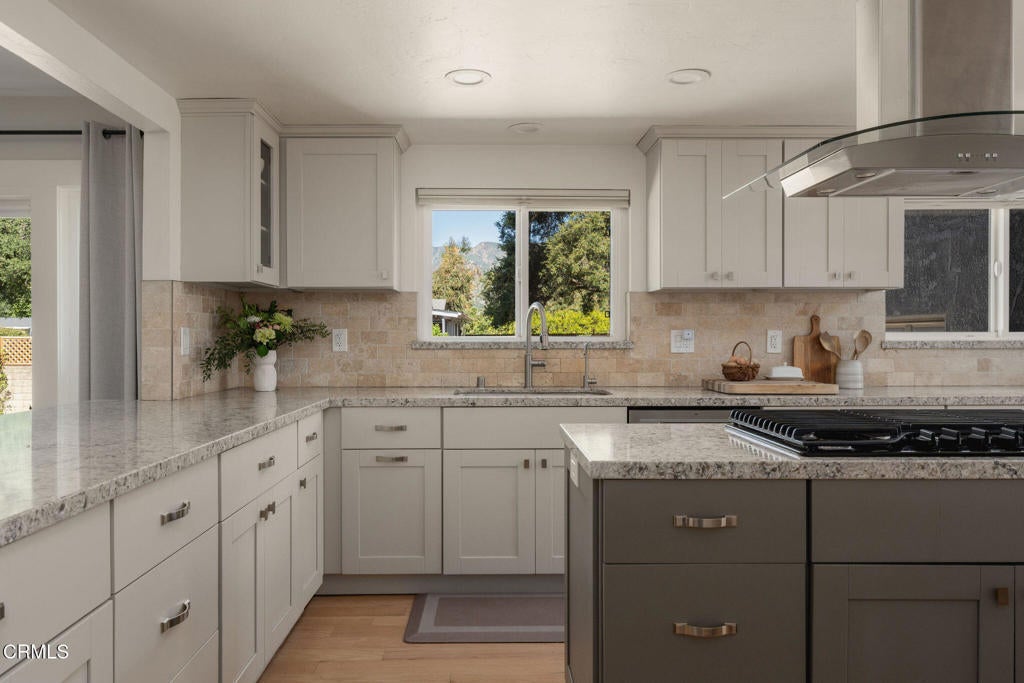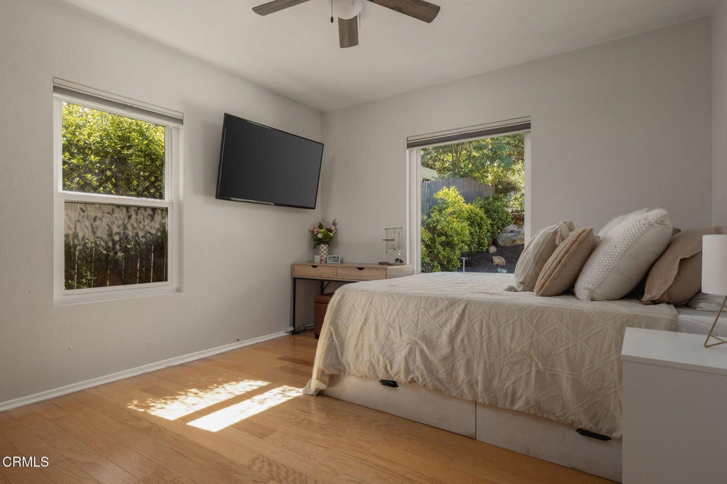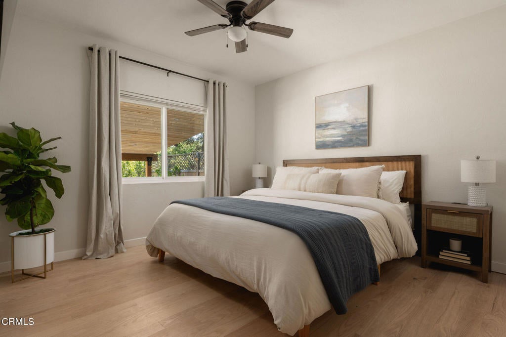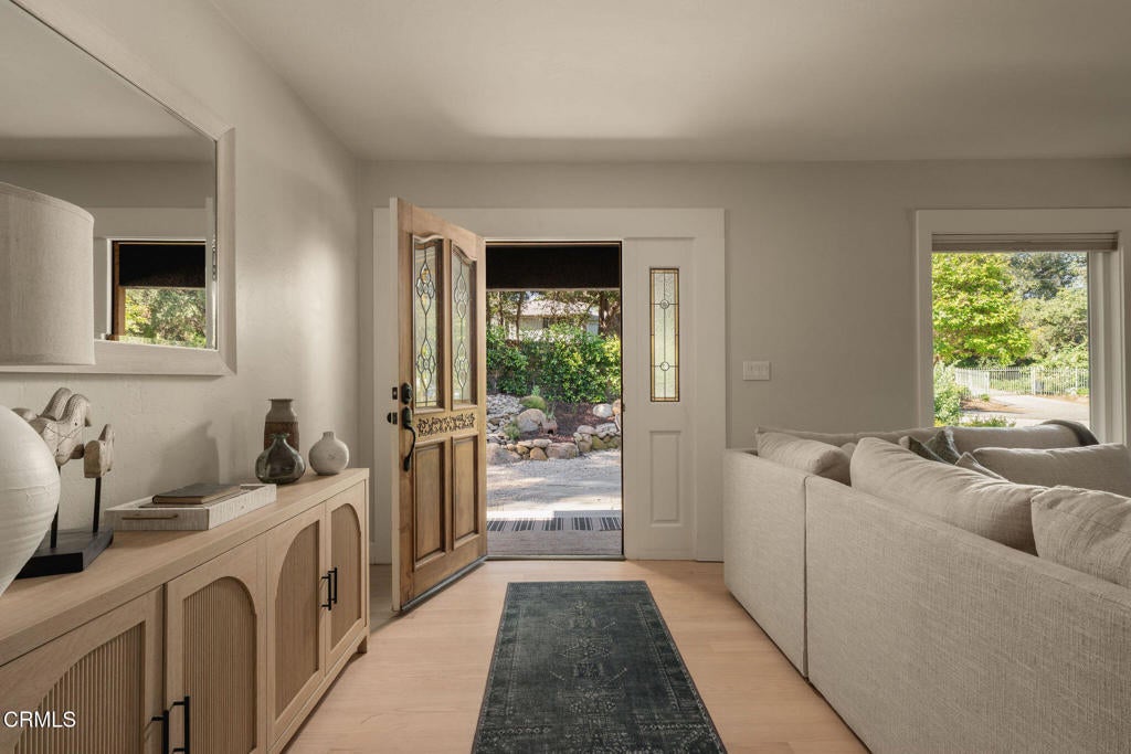 Tucked at the end of a quiet cul-de-sac in Meiners Oaks, this inviting property offers peaceful living with beautiful mountain views, including glimpses of Chief's Peak. The main residence features 3 bedrooms and 2 bathrooms across approximately 1,600 sq ft, highlighted by recently refinished solid red oak floors, remodeled bathrooms, and a lightly updated kitchen. The inviting living space, centered around a charming fireplace, creates the perfect place to gather, unwind, and feel at home. Set on over half an acre, the property includes an expansive driveway and an oversized two car garage with newly added storage above. Step outside and the property truly begins to unfold. Beneath a newly built patio cover, long afternoons turn into memorable evenings, dining al fresco in the soft Ojai light. The backyard is anchored by a majestic oak tree, with a sparkling pool, cabana, and separate 256 sq ft pool house/office thoughtfully arranged around it. Whether hosting guests, creating a private workspace, or enjoying a quiet moment poolside, the setting offers exceptional flexibility and charm. Beyond the main yard, the property opens to a variety of mature fruit trees including avocado, citrus, persimmon, pomegranate, apricot, and nectarine. With ample space for animals, gardening, or expanded use, the property also includes a large metal-covered barn, a 20-foot shipping container for storage, and convenient rear access from the road behind. A rare opportunity to enjoy space, versatility, and the Ojai lifestyle in a peaceful setting, plus a special feature you'll have to see in person.
