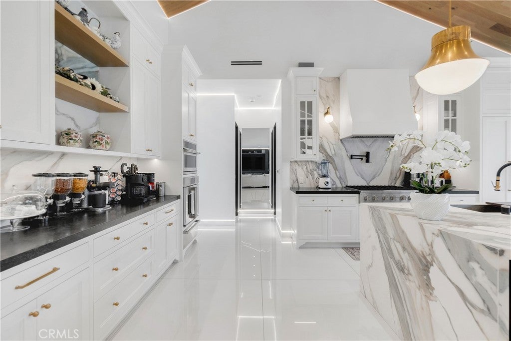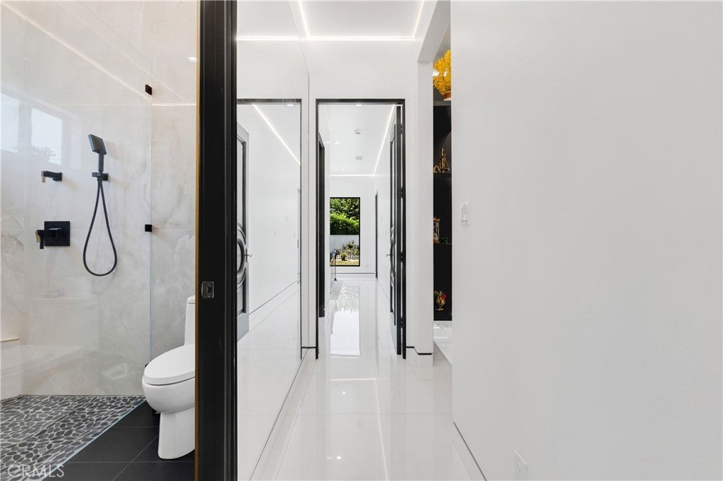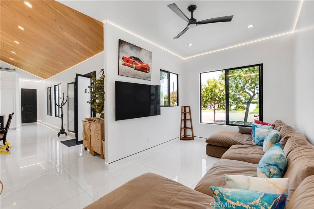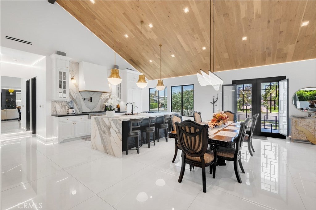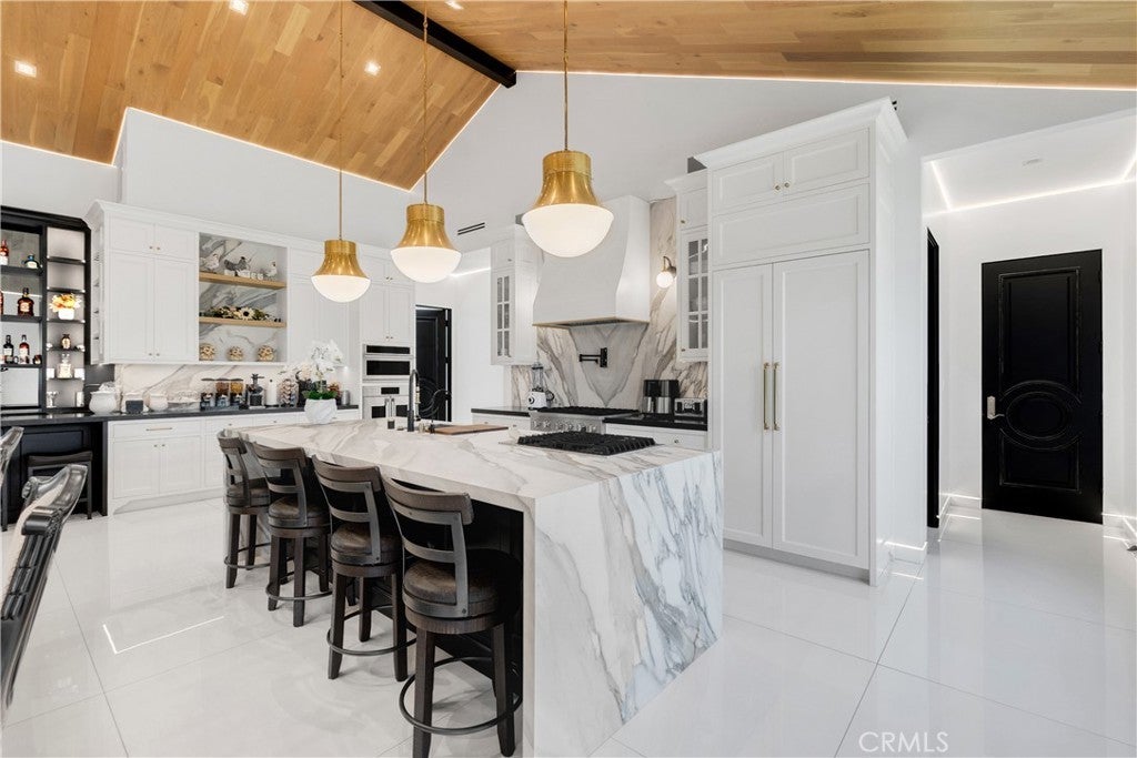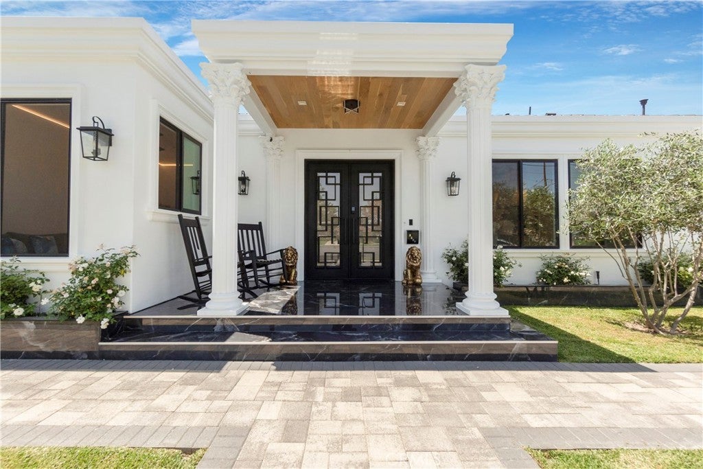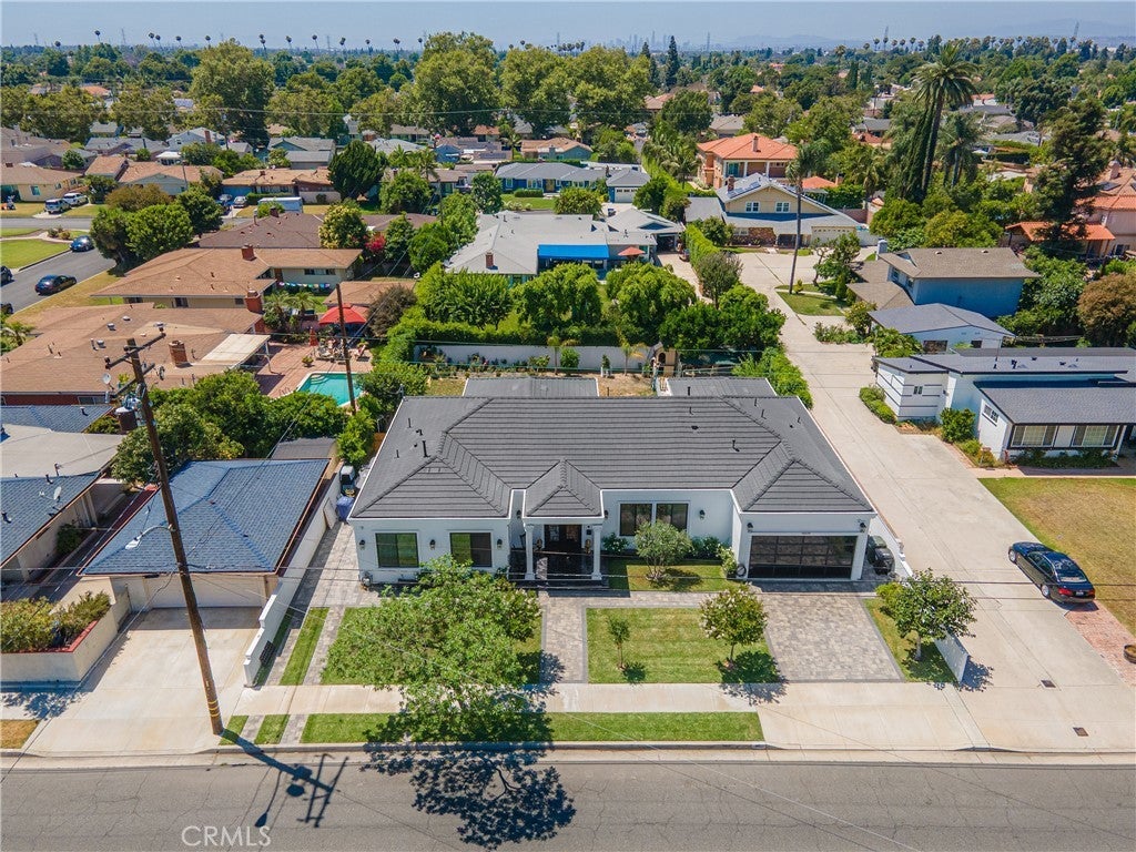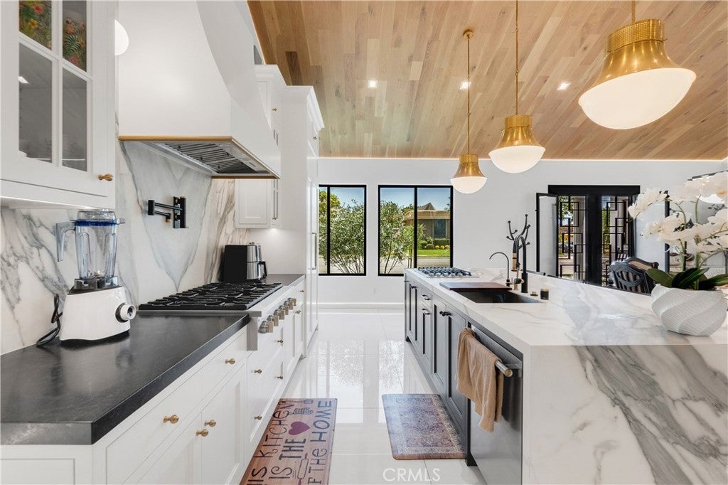 Welcome to this one-of-a-kind, newly built luxury estate nestled in one of Downey's most desirable neighborhoods. Boasting 2,159 square feet of brand-new construction on an oversized 9,529 square foot lot, this exceptional 5-bedroom, 3-bathroom residence offers the perfect blend of timeless elegance and modern design. Every inch of this home was thoughtfully reimagined and constructed from the ground up with no expense spared. Step through grand custom double doors into a light-filled open floor plan featuring dramatic vaulted wood ceilings, oversized porcelain tile flooring, and exquisite LED mood lighting throughout. The designer kitchen is a true showpiece, highlighted by a massive waterfall island wrapped in rich marble, a built-in gas cooktop, custom white cabinetry, double ovens, and a separate coffee bar. Enjoy the convenience of a full bar area with built-in shelving and wine display, ideal for entertaining in style. The elegant dining area flows seamlessly into the spacious living room, complete with a custom black media wall, integrated fireplace, and built-in shelving. Expansive windows and glass doors create the perfect indoor-outdoor experience, leading to the covered patio with custom ceiling design and views of the oversized backyard ready for your dream pool or garden oasis. The home offers five generously sized bedrooms and three spa-like bathrooms featuring floor-to-ceiling marble finishes, walk-in showers with custom stone tile flooring, and luxury vanities. Additional highlights include: • Gated private driveway • Custom iron double entry doors • Designer lighting and fixtures • Oversized laundry/mud room • Two-car garage with modern glass doors • Fully landscaped front yard and spacious backyard with endless potential This rare gem offers luxury, space, and architectural beauty in one of the most sought-after communities in Downey. A must-see property for the most discerning buyer.