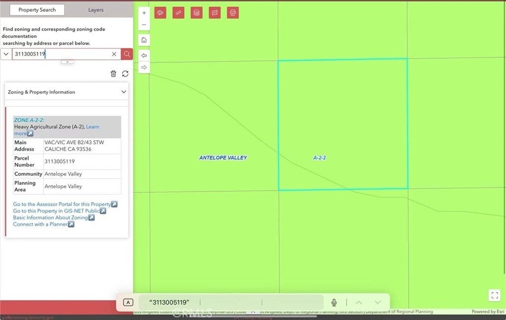 Parcel Number 3113-005-119 is located in the Antelope Valley community of Los Angeles County. This lot is zoned A-2-2 (Heavy Agricultural Zone), which allows for a variety of agricultural and related uses under Los Angeles County zoning regulations. Zoning: A-2-2 (Heavy Agricultural Zone) Address: Vac/Vic Avenue B2/43rd St W, Caliche, CA 93536 Community: Antelope Valley Planning Area: Antelope Valley The parcel is highlighted within the Antelope Valley planning area and is suitable for buyers interested in agricultural, investment, or future development opportunities.