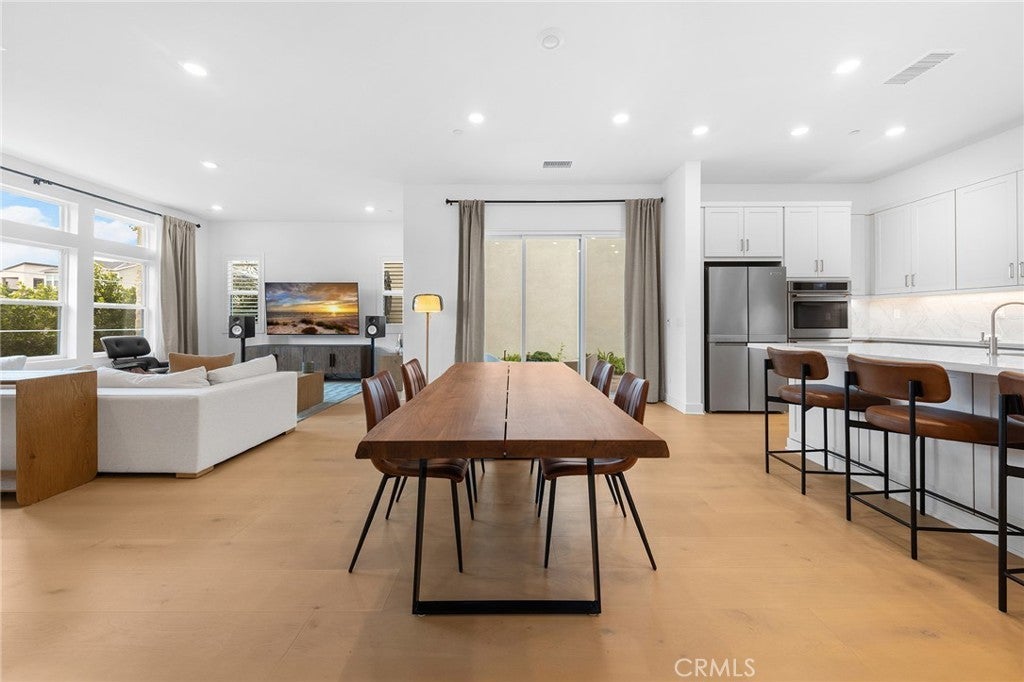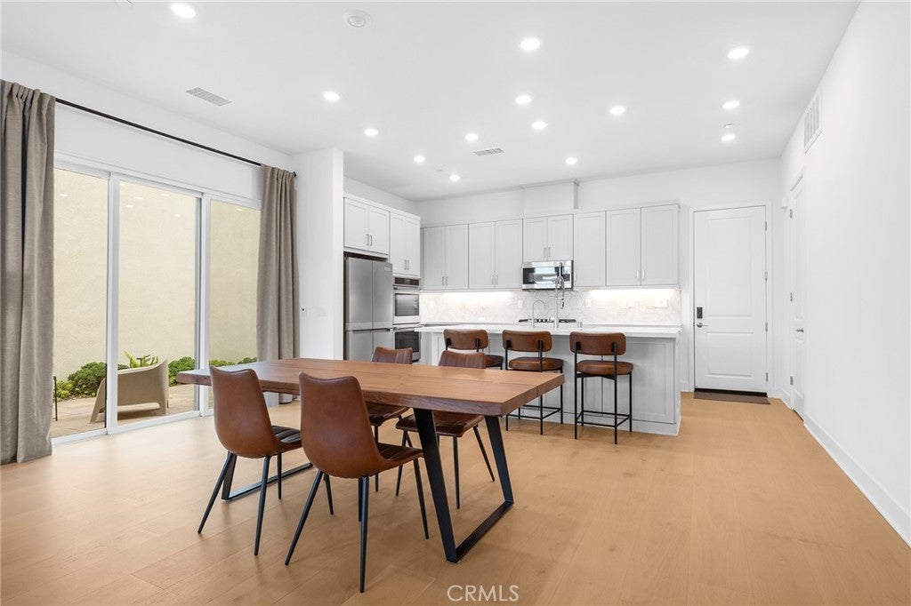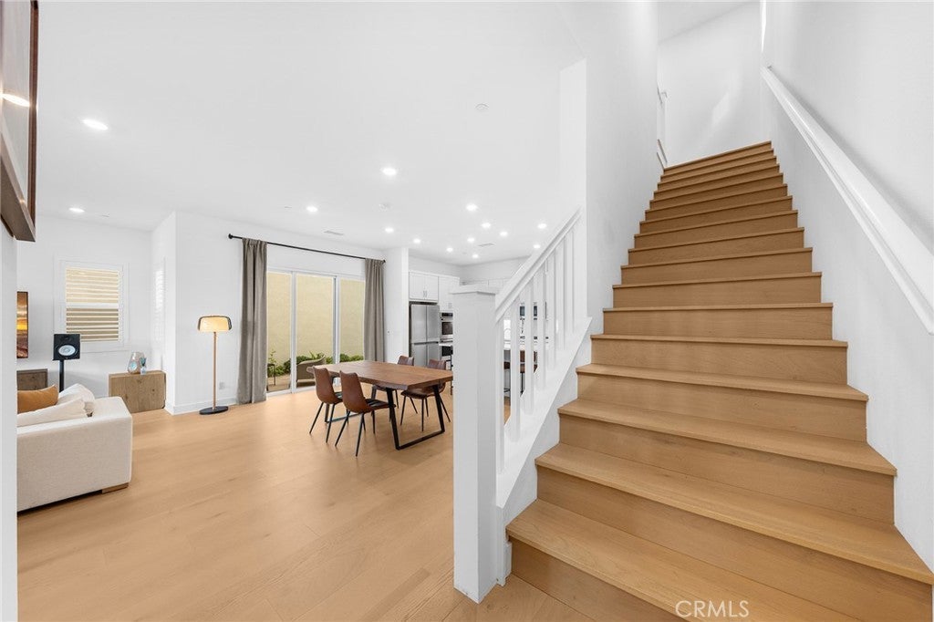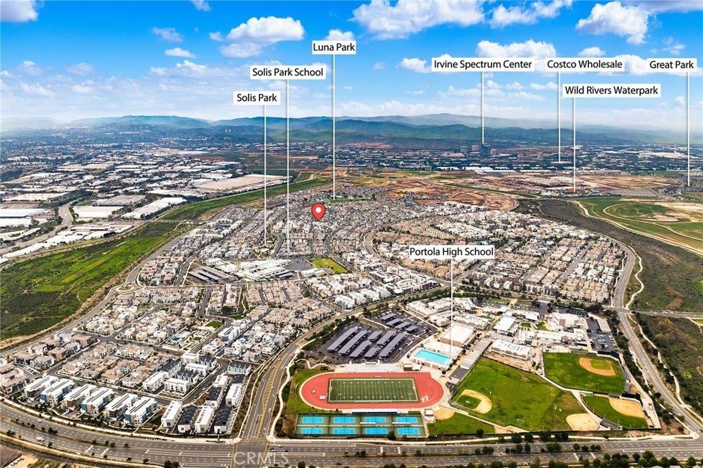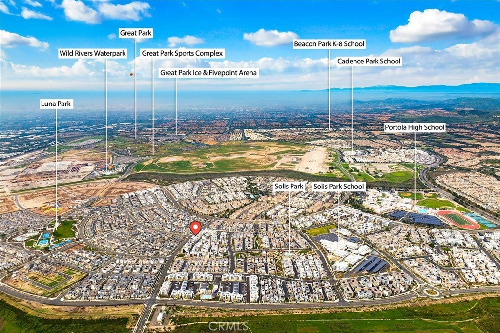 This exceptional residence offers the largest floor plan in Stratus at Solis Park in Irvine Great Park, featuring 4 bedrooms, 4.5 bathrooms, and approximately 2,904 square feet of thoughtfully designed living space. With 10-foot ceilings on every level and a premium lot location, the home is bathed in natural light and offers an open, airy ambiance throughout. The main level showcases a spacious open-concept layout that seamlessly connects the living room, dining area, and gourmet kitchen—ideal for both everyday living and entertaining. The kitchen features a large center island as a natural gathering point, complemented by quartz countertops, designer backsplash, and luxury engineered wood flooring throughout the home, creating a refined yet warm modern aesthetic. Upstairs, the second level is dedicated to comfortable living, anchored by a generously sized primary suite with a walk-in closet, dual vanities, a soaking tub, and a walk-in shower. Additional bedrooms are thoughtfully laid out to balance privacy, functionality, and comfort. The third-floor bonus space offers exceptional flexibility, complete with a full bathroom and access to a spacious private balcony with open views—the perfect spot to enjoy sunsets and distant city lights, whether unwinding at the end of the day or hosting guests. This level is ideal for a home office, guest suite, media room, or multi-generational living. Outdoor areas are equally well considered, featuring a beautifully paved side yard that is both low-maintenance and visually appealing. The epoxy-finished garage adds a clean, polished touch, ideal for organized storage or daily use. Residents enjoy resort-style community amenities, including pools, parks, clubhouse, BBQ areas, and scenic walking trails, all while being within walking distance to top-rated Irvine Unified School District schools. Combining the largest Stratus floor plan, extensive upgrades, and an unbeatable Great Park location, this home presents a rare opportunity to own one of the most desirable residences in Solis Park—where modern design meets elevated Irvine living.