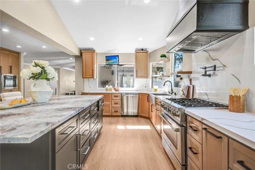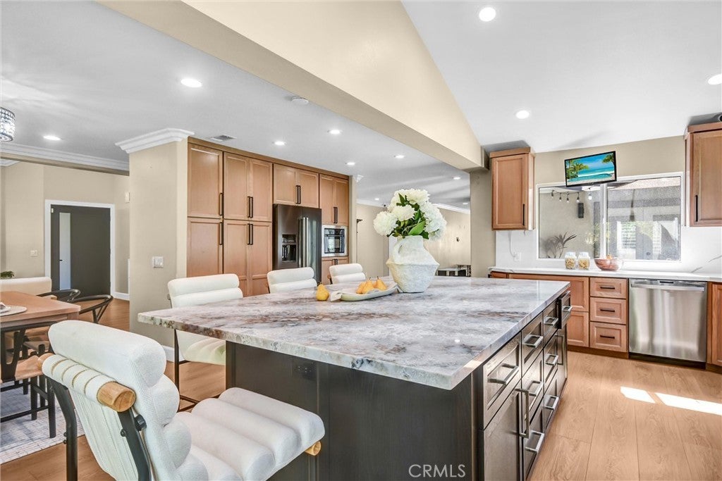 Welcome to 19201 Lydle Creek in Walnut, a beautifully maintained and upgraded 5 bedroom, 3 bathroom home with 2,937 square feet of thoughtfully designed living space. Throughout the home, you will experience updated paint and flooring, complemented by timeless real wood plantation shutters. The main floor features a bedroom and full bath, ideal for guests or multigenerational living, along with a spacious den and sunroom that provide flexible areas for a home office, playroom, or extended entertaining space. At the heart of the home is a custom designed chef’s kitchen crafted with solid wood cabinetry and abundant storage, thoughtfully curated for those who love to cook, complete with an oversized island, pot filler, and built-in fridge. The open flow between living areas makes gatherings effortless while still offering comfortable everyday living. Upstairs, the master bedroom is enhanced with its own mini split system for personalized climate control with its ensuite bathroom and walk-in closet. Major systems have been carefully upgraded, including two newer AC units, a water heater, and copper plumbing, offering added peace of mind. The home also offers two washer and dryer hookup locations, one in the designated indoor laundry room currently used as a mudroom and another option in the garage. The epoxied three car garage provides abundant storage, and the beautifully manicured backyard is designed for year round enjoyment with a gazebo, gas connected BBQ, gas connected fire pit, and fruit trees including lime, passionfruit, pomegranate, and golden berry, creating a private and inviting retreat that truly reflects the care and pride invested in this exceptional home. Not to mention, the solar panels can provide you substantial savings on electricity each month! This exceptional home is ideally and conveniently located close to top-rated schools (including Oswalt Academy K-8 and Mt Sac College), grocery stores, restaurants, and freeway access, making daily life effortless and enjoyable.
