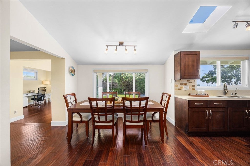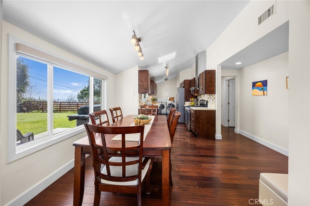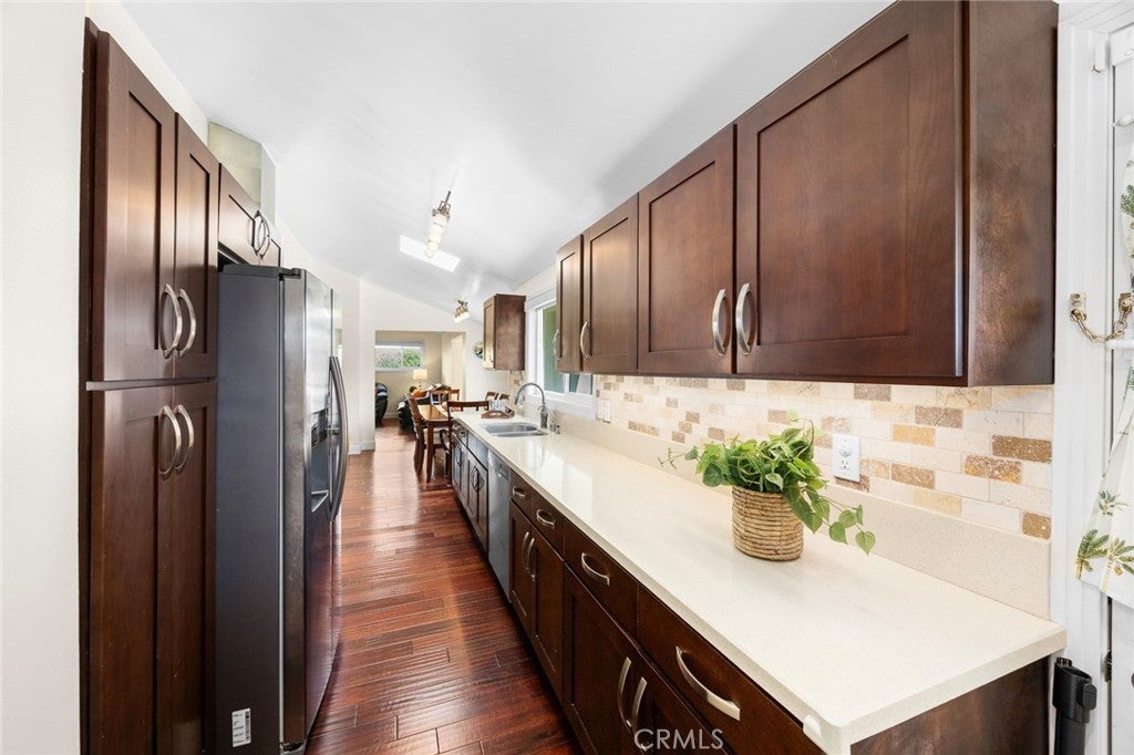 A charming 3-bedroom 2-bath home situated in the desirable and serene area of La Crescenta, surrounded by beautiful mountain and valley views. The light-filled living room with high ceilings & a fireplace, creating a warm & inviting atmosphere. A separate step-down family room offers additional living space & includes a study nook, ideal for an office or homework area, & a sliding glass door opens to the backyard. The formal dining area sits adjacent to the kitchen and has large picturesque window overlooking the lush backyard. The updated kitchen offers granite countertops, dark wood cabinetry with hardware, stainless steel appliances, a vented range hood, & a skylight that fills the space with natural light. The laundry area is conveniently located next to the kitchen & has a side door providing direct access to the backyard. The primary suite has its own private full bath with a glass-enclosed tub/shower combination and tile surround. Two additional bedrooms share a hallway full bath, also with a glass-enclosed tub/shower & tile surround. The backyard is peaceful & serene, with lush landscaping, a patio area & beautiful valley and mountain views. The generous flat lot offers space for outdoor entertaining, gardening, or future possibilities. 2-car garage with automatic opener & driveway with pavers providing extra parking. Additional features include copper plumbing, dual-pane windows, ceiling fans in the living room & all bedrooms, wood flooring in the main living areas, tile flooring in bathrooms, & central air & heat. Recent improvements include: a new Class A roof (TruDefinition Duration Cool Plus Midnight architectural shingles), new exterior paint, new fence in 2024; new sliding patio door in 2023; new 35-ft sewer line from house to street in 2021; seismic retrofit upgrade & new water heater in 2019; and a 200-amp electrical panel & new kitchen hood vent/duct in 2015. With these upgrades and improvements, the home offers added peace of mind. A wonderful opportunity to own this lovely La Crescenta home with renowned schools.