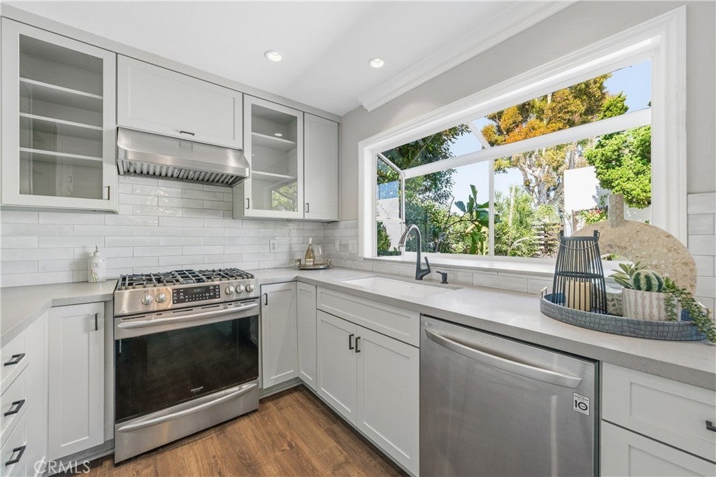 Welcome to this beautifully maintained and rarely available 4-bedroom, 2.5-bath end-unit home ideally located in the highly desirable Eastbluff community of Newport Beach—just steps from top-rated schools. Offering 1,564 square feet of living space, this home showcases pride of ownership with hardwood flooring, crown molding, recessed lighting, dual-pane windows, and plantation shutters throughout. The remodeled kitchen features stainless steel appliances, a 5-burner gas range, sleek countertops, and a garden window, opening to a private patio with a tranquil fountain—perfect for outdoor dining and entertaining. The main level includes a bright living room with a fireplace, formal dining area, office nook, and powder room. Upstairs offers a spacious primary suite and three additional bedrooms—an uncommon 4-bedroom layout in this community. Additional highlights include a finished garage with epoxy flooring and built-ins. Community amenities include pools and spa. Conveniently located near parks, shopping, dining, and just minutes to the beach.